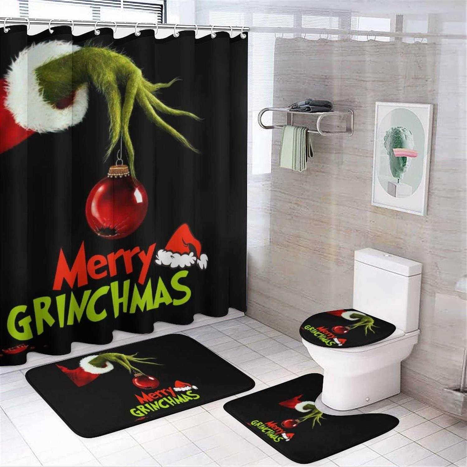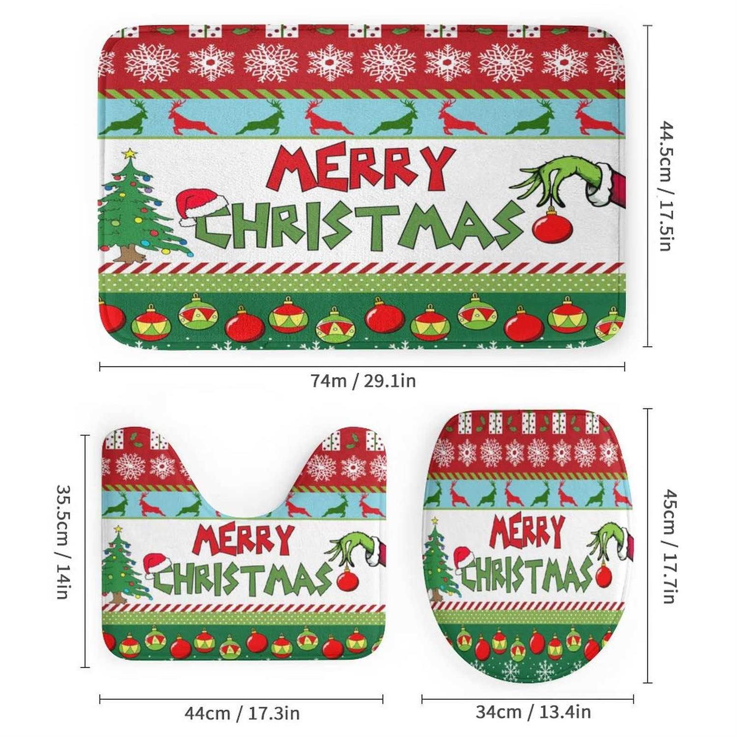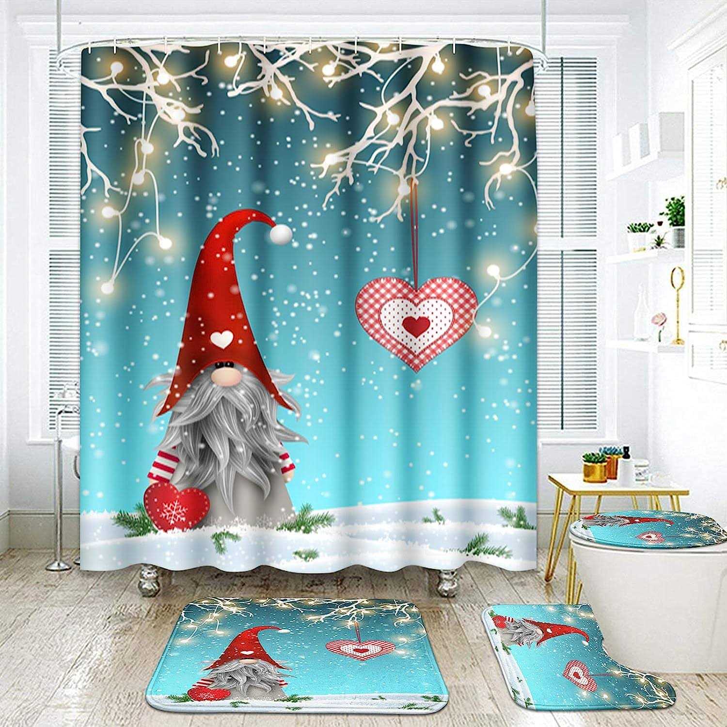 Layinusg 4pcs Merry Christmas Shower Curtain Set with Non-slip Rugs