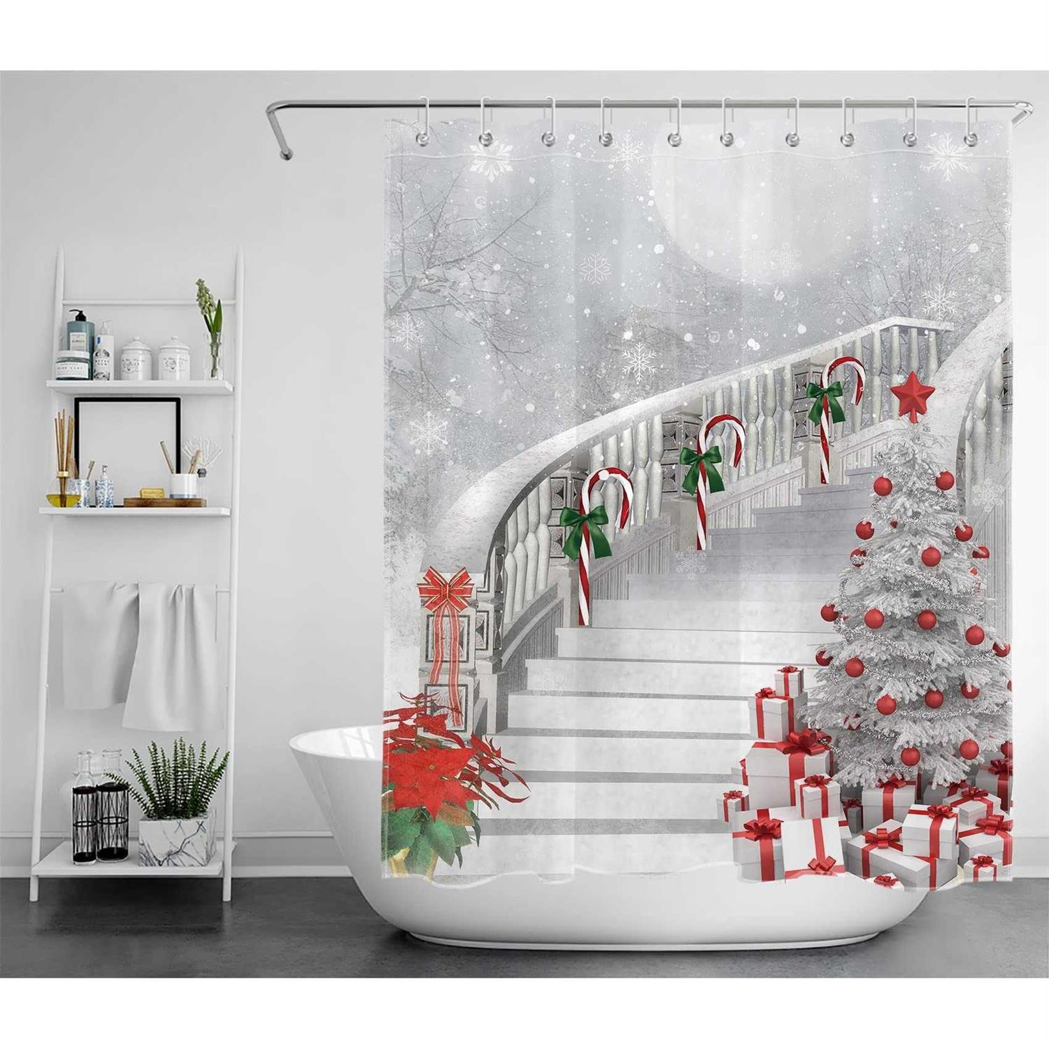 LB Merry Christmas Season Eve New Year Decorative Decor Gift Shower Curtain Polyester Fabric White Night Snow Candy Cane