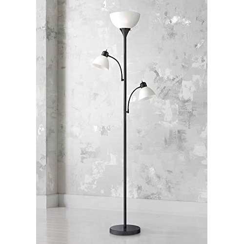 Overall: 71 1/2″ high. Top light is 10″ wide x 5″ high. Side lights are 6″ wide x 4″ high. Base is 10″ wide. Uses one 150 watt medium base bulb for the main light and two 40 watt medium base bulbs for side lights (not included). Individual on-off switches for each light. 3-light torchiere floor lamp from the 360 Lighting brand. Black finish. Metal construction base and pole. ABS shades.