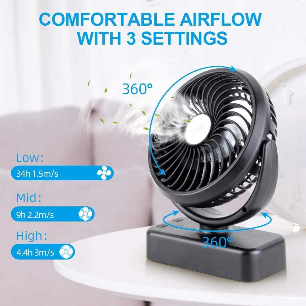 BORN FOR CAMPING: This upgraded portable fan combines tent fan, camping light and aroma diffuser, circulate air evenly, lights up your tent or campsite in darkness VERSATILE PLACEMENT: This camping fan has a built-in hook to hang it on the tents, branches or inside a car. It can be mounted on wall as well as simply placed on desk at home or in office. It’s also a great companion for your baby and pets Powered by rechargeable 5000mAh batteries (built-in),it can last up to 40 hours with fan only, 18 days with light only.It also operates via USB cable connected to laptop, car charger, Power bank and etc.Perfect fit for both indoors&outdoors Set with 3 speeds, Whisper operation, Manual 360 degree rotation vertically and horizontally, ventilating air efficiently for a more comfortable space; equipped 12 bright LEDs with 3 brightness for different purposes like reading, illumination Portable Compact: The travel fan is of mini size (2. 4*5. 3*7. 1 Inches), lightweight (11. 3oz), easy to take on the go and store. It reduces the weight/space of your backpack by saving from taking separated fan and light