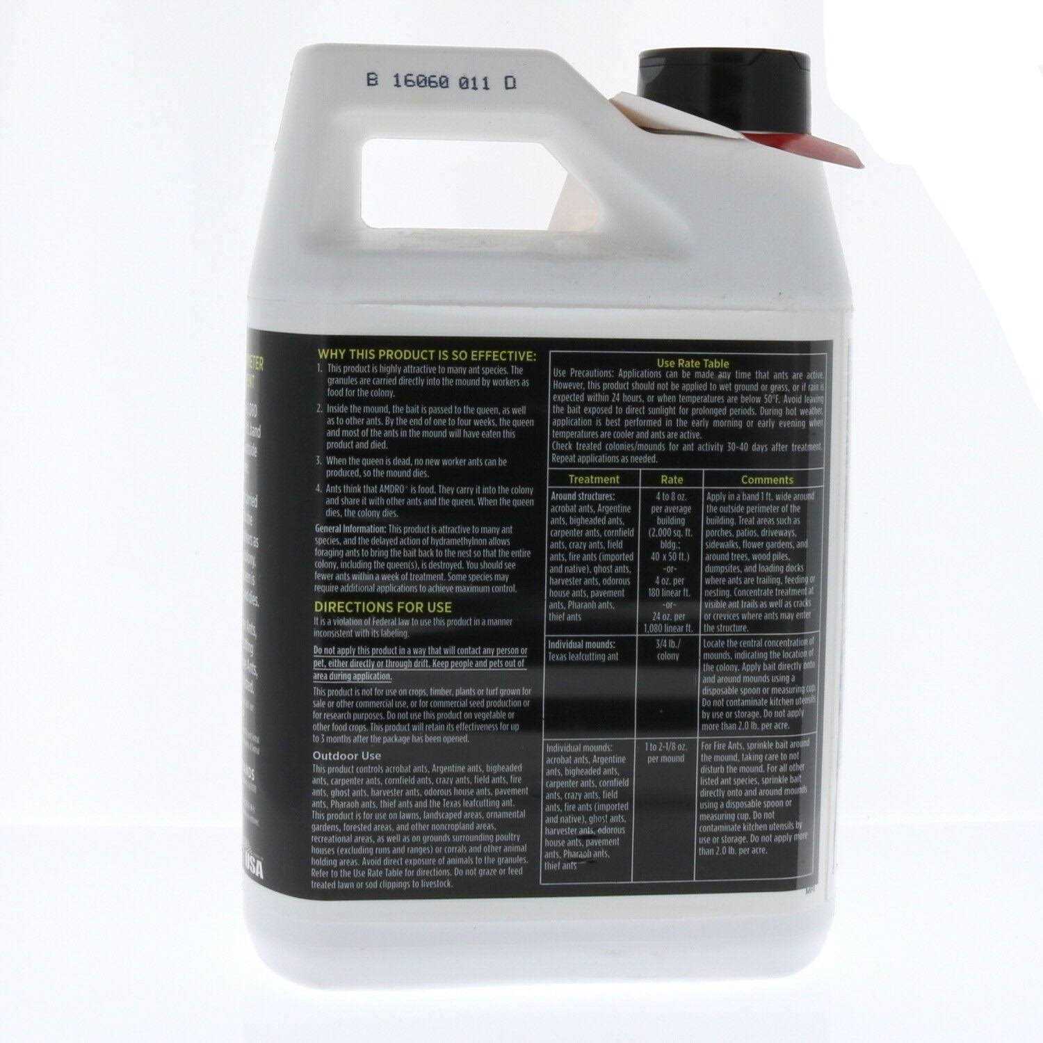 AMDRO Ant Block Home Perimeter can be used on lawns, landscaped areas or around structures. Ant Bait will kill listed ant species outside before they enter your home. Worker ants carry it back to the mound thinking its food. Once the queen eats it, the colony is doomed. Each bottle contains enough bait to treat the average home up to six times. Apply at a rate of 4 Oz per 180 linear feet, apply in a band 1 feet wide around the outside perimeter of the building.