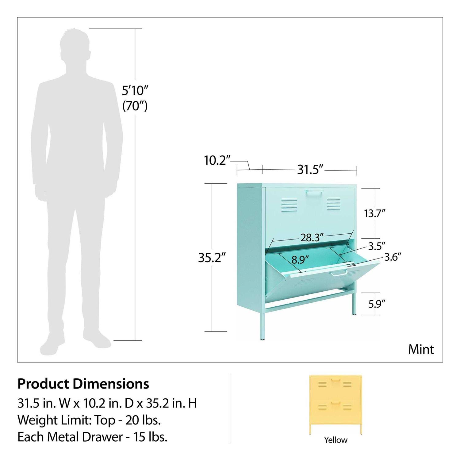 Keep your entryway free of clutter with help from this shoe cabinet. The storage locker offers space for up to 12 pairs and is made of steel to handle years of use. Made of steel to last for years. 2 metal drawers can fold out when access is needed. 2 doors to house up to 12 pairs of shoes up to US Women’s size 14. Locker-style storage includes a wall anchor kit and instructions. Weight capacity tested to support 50 lb. Assembly required. Bold yellow color to brighten your space.