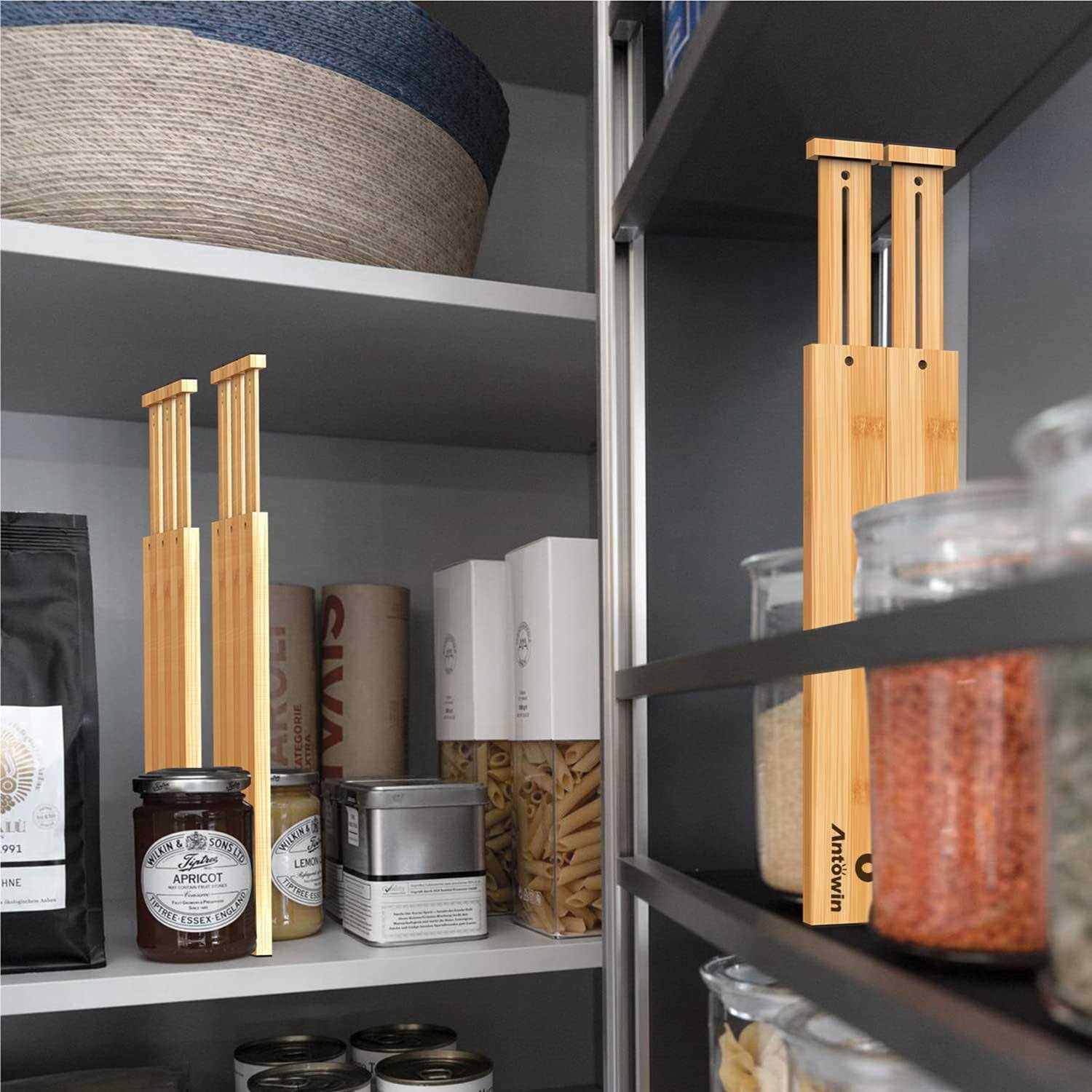 ECO FRIENDLY BAMBOO: Bamboo adjustable drawer dividers are durable, sturdy and have a great design,bringing you super smooth, sturdy & durable drawer dividers for your healthy life. EXPANDABLE AND ADJUSTABLE kitchen drawer organizer: Each Measures 17 ” x 2.36 ” x 0.6 ” ; Expands from 17 ” to 22 ” long. 4 pcs Small drawer divider Measures 3.7 ” x 2.36 ” x 0.5 ” . Easily adapt compartment spaces to contents with these expandable dividers to create a customized storage solution. ORGANIZED DRAWERS: The drawer dividers from ANTOWIN are the best way to avoid a mess in the kitchen, bathroom, bedroom or elsewhere in your home or office. These bamboo drawer separators will help you keep everything organized and tidy at all times MULTIPURPOSE BAMBOO DRAWER DIVIDERS: Store and organize socks, women’s leggings, sports bras, yoga pants, lingerie, tights, t shirts, scarves, belts, accessories and more; The dividers expand to desired length and lock into place to keep everything situated. EASY INSTALLATION: Each drawer divider has a built in spring to keep them in place and easy adjustment to meet your changing needs.The built in foam pads on the ends of the bamboo drawer dividers help keep the drawer organizers sturdily in place. This also will protect your drawer from scratches or any other damage. 1