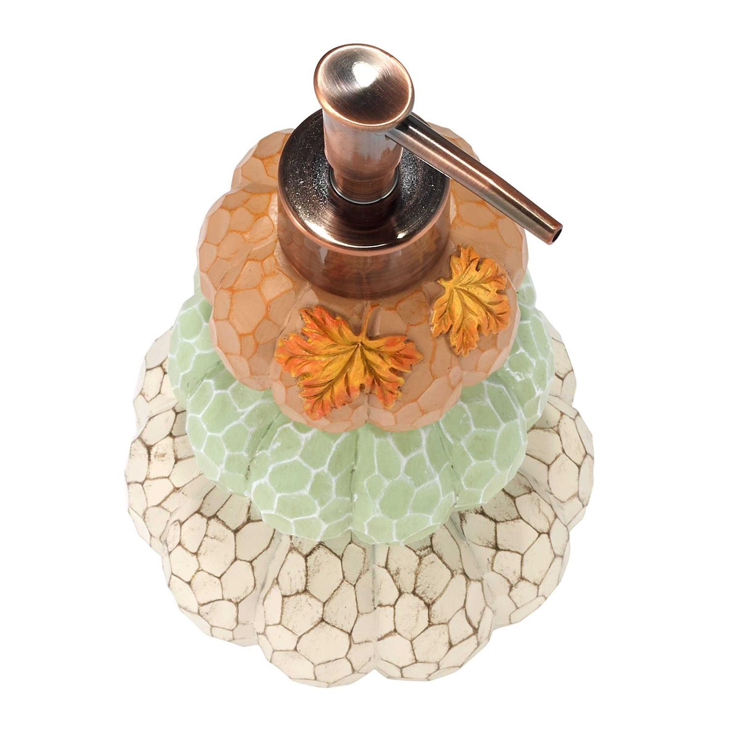 The Avanti Grateful Patch Lotion/Soap/Sanitizer Dispenser features three stacked textured pumpkins in light orange, aqua, and off-white. Made of durable, hand-painted resin. Brings a touch of fall to any décor and any room-bathroom, kitchen, or office. 3.54″ x 3.54″ x 8.27″. Resin. Wipe clean.