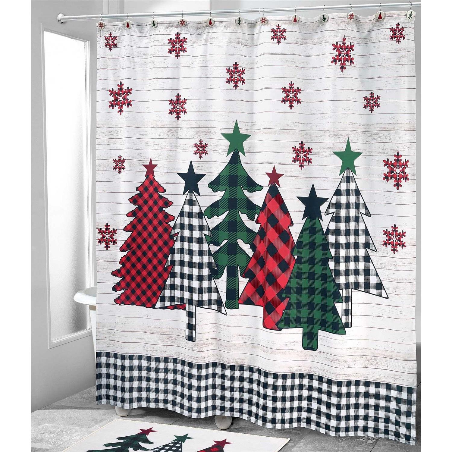 The Avanti Tis the Season Shower Curtain features 6 unique red, white and green plaid Christmas trees on a white and beige woodgrain ground, surrounded by red stars. A black and white plaid bottom border finishes the look. 72 inch x 72 inch, printed on 100% polyester. Imported.