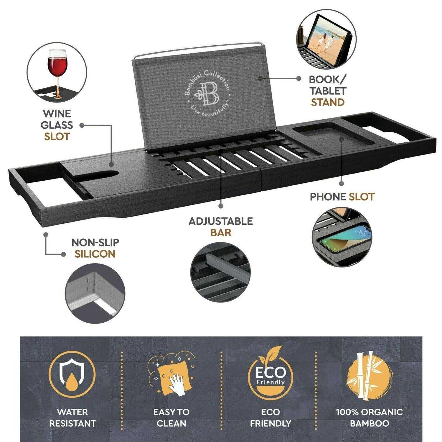 Bambusi Bathtub Caddy with Extendable Sides, Wine Glass Holder, Book Stand and Phone Tray