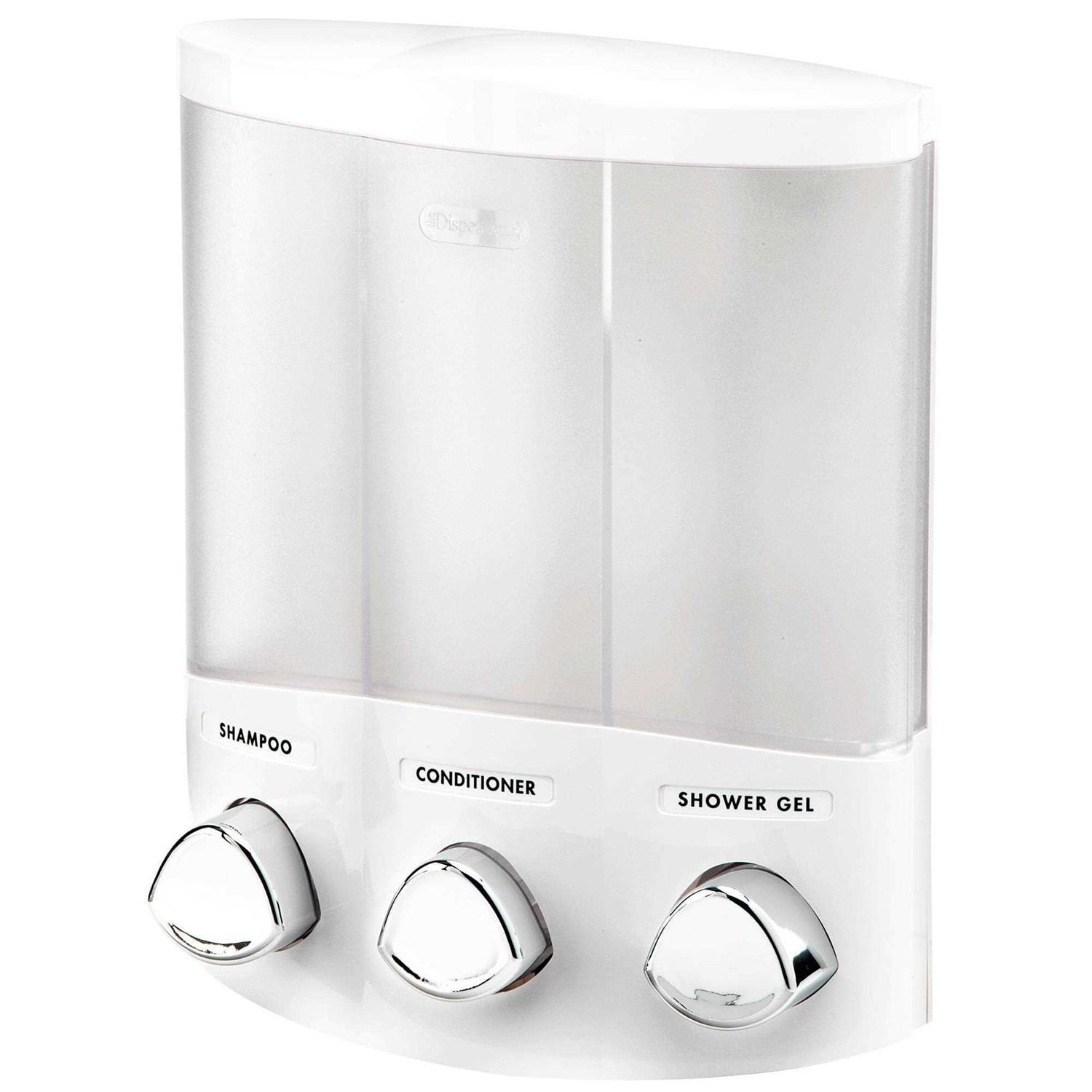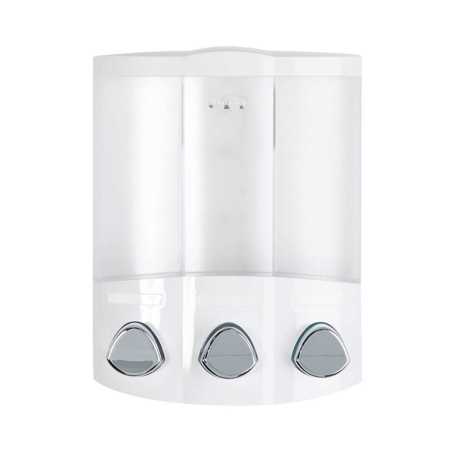 The Euro series of soap and shower dispensers are beautiful solutions for the messy problem of bottle clutter. The Trio is easy to install and easy to use, and it is the perfect shower accessory, whether you install it flat on the wall or in a corner to make use of un-usable shower space. Set includes: Three lotion/soap dispensers. Pattern: Solid Texture: Smooth Color options: White. Materials: Plastic. Dimensions: Lotion/soap dispenser: 8.75 inches high x 7 inches wide x 3.75 inches long.