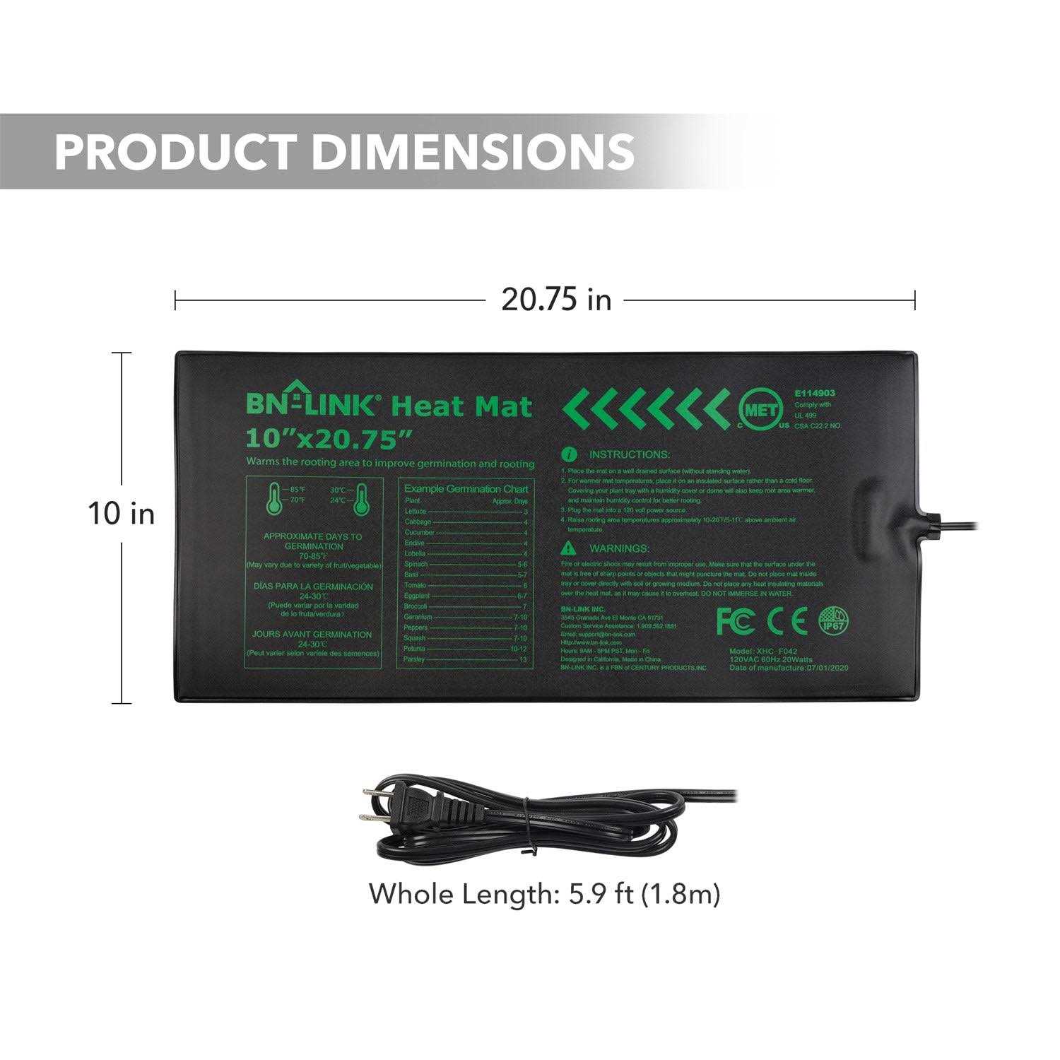 IDEAL GERMINATION TEMPERATURE: The BN-LINK Durable Seedling Hydroponic Heating Pad provides consistent, uniform heating at temperatures around 70°F to 85°F (24°C to 30°C), which are the perfect temperatures for seed starting and cutting propagation. CONSISTENT HEATING: The heating wire and insulation allows the mat to reach the desired temperatures within minutes without burning your seeds and keep the roots of your plants warm. You can leave it on 24 hours a day without worry. EASY STORE AND CLEAN: The supple nature of BN-LINK Seedling Heat mat makes it easy to store, simply roll up the mat and wrap the cord around it. When it’s time to start seeds again, it will roll out easily and perform its task.The mats are easy to wipe clean with just a damp cloth and will resist rusting and corrosion. DURABLE AND FLEXIBLE: The BN-LINK Durable Seedling Heating Mats feature multiple layers of flexible waterproof PVC that encase heat-conducting wire. The outer layer is sealed to protect the internal heating elements. Perfect for seeding, germination, home-brewing, and pet enclosures terrariums, such as those used in reptile, rodent and arachnid. GREAT SIZE AND SAFE: 10″ x 20.75″, 20 Watts. The mat is the perfect size for standard plastic growing tray.