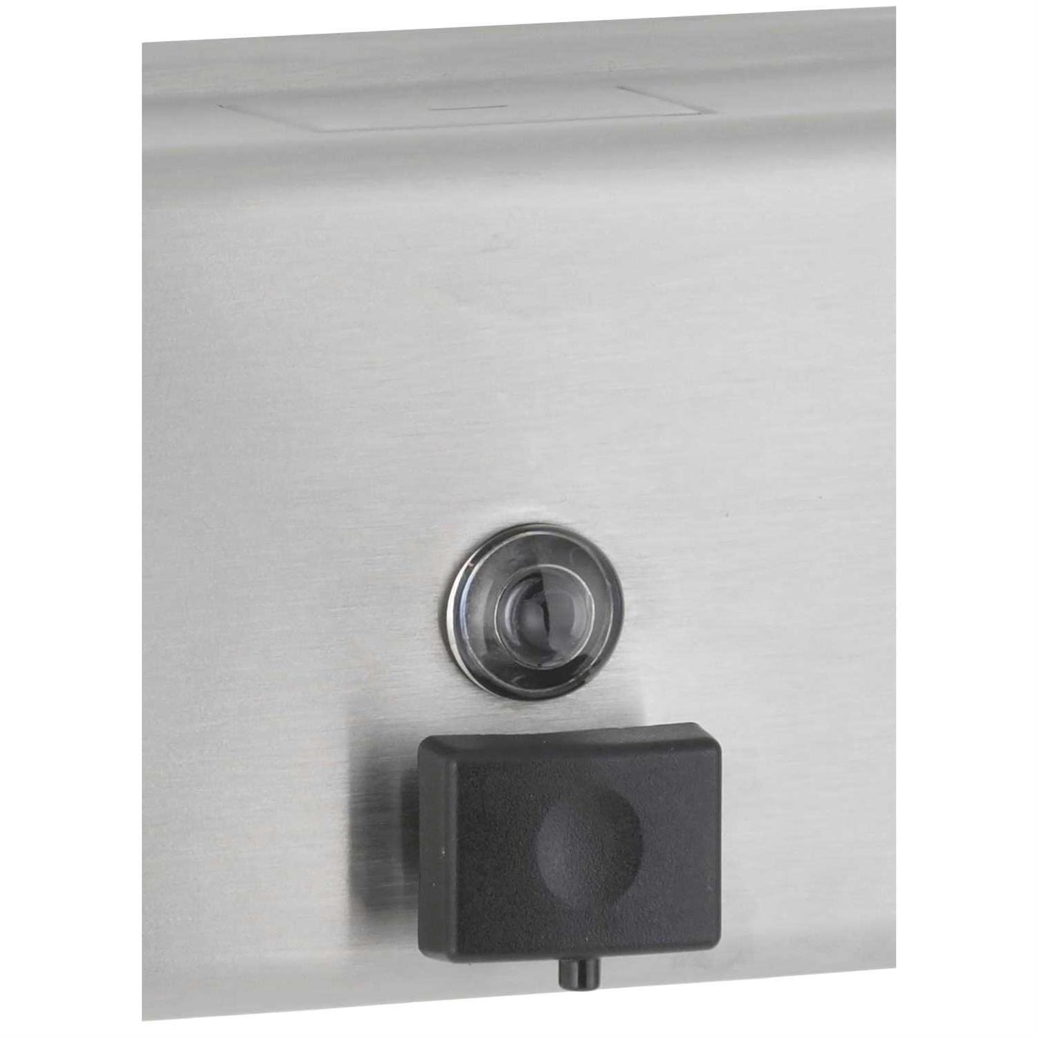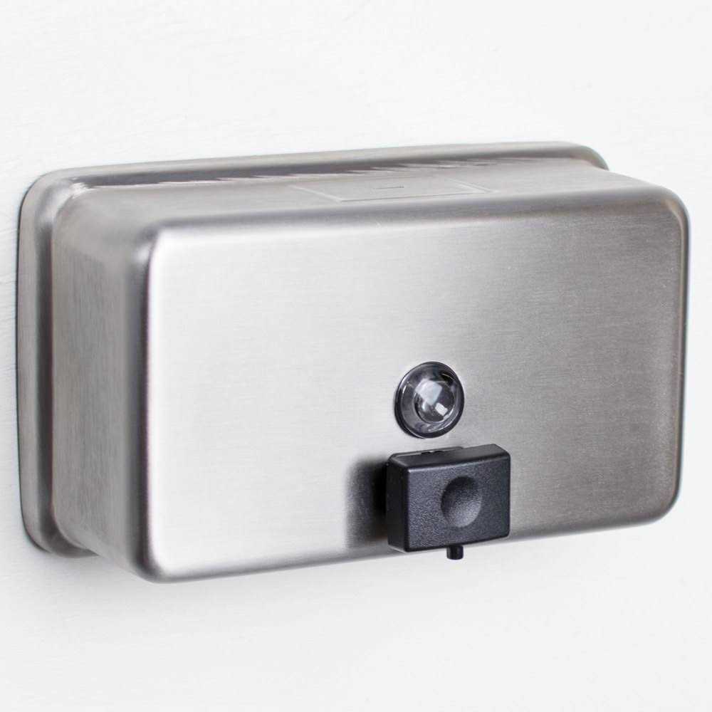 Bobrick B-2112 ClassicSeriesu00AE nSurface-Mounted Soap DispensernHorizontal tank is satin-finish stainless steel. Valve dispenses all-purpose hand soaps. Soap refill window. Concealed wall fastening. Hinged filler-top requires special key to open. Vandal resistant. Unit 8 1/8u2033 W, 4 3/4u2033 H 205 x 120mm wall to push-button, 3 1/2u2033 90mm.