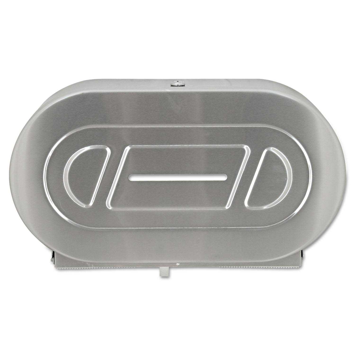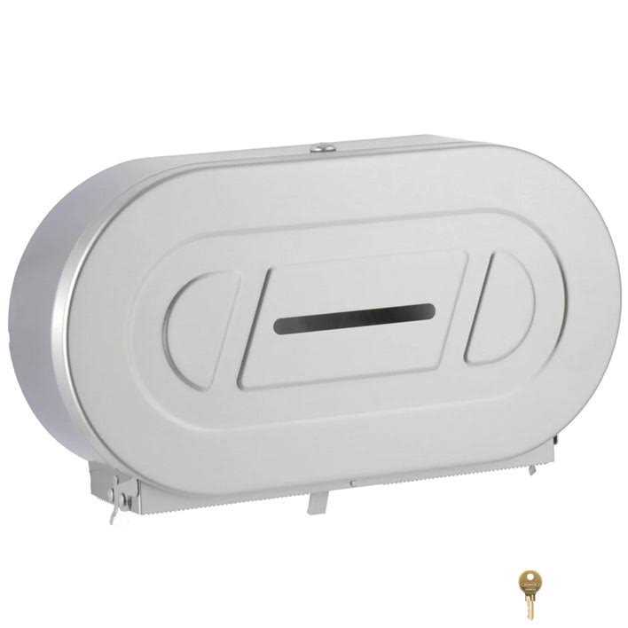 Bobrick 2892 Toilet Tissue 2 Roll Dispenser Stainless Steel jumbo 20-13/16wx5 15/16dx11-3/8h. Wide viewing slot in the dispenser allows you easily view how much toilet paper is left on both rolls. Dispenser is equipped with a tumbler lock which prevents theft and makes for quick and easy reloading.