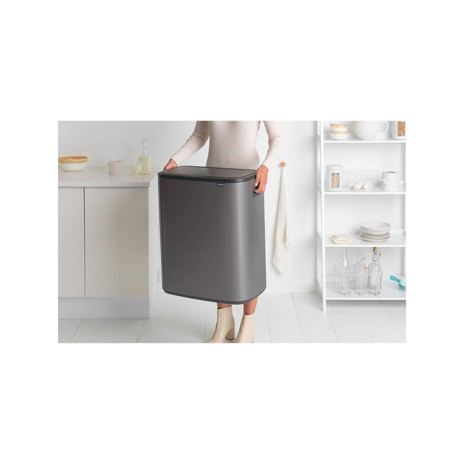 The Brabantia Bo Touch Bin Trash Can 2x 30L makes separating trash very easy. Thanks to the total capacity of 60L, the trash can is suitable for a large family. The 2 inner buckets of 30L can be removed from the trash can separately. This allows you to empty the trash bags separately and you can easily clean the trash can. With Brabantia’s soft-touch system, you can open the trash can with a light press on the lid. Thanks to its rectangular shape, you can easily place the trash can against the wall or in a corner so it’s not in the way.