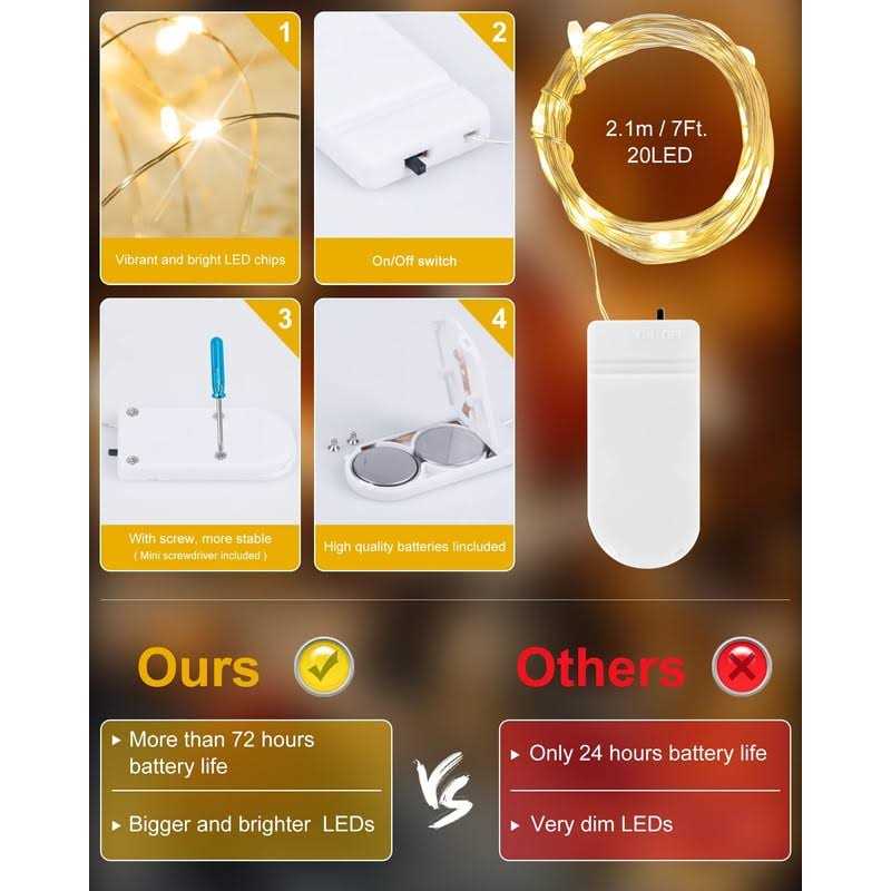 Use 0.66 feet cable between the the first led and battery box, 4 inch distance between led moon lights. 2 x CR2032 batteries per lights and a screwdriver included, 72 hours of battery life Flexible silver wire: The starry moon fairy lights are made of a soft bendable silver wire. Easy to bend it to any shape or wrapped it on anything you want like wreaths, trees, plant, flowers, weddings décor IP65 waterproof starry lights: The fairy moon string lights is IP65 waterproof and can be used indoor and outdoor without any worry of moisture or weather damage or short circuit. Only the string lights is waterproof, the battery pack is not waterproof Safe and energy-saving: The silver wire starry moon lights are low power and insulates heat, remain safe to the touch. It looks like many stars flashing when you put the lights in the glass jar. Prefect for creating harmonious and romantic atmosphere for your home. The silver wire is flexible, you can bend it to any shape or wrapped it on anything you want like wreaths, trees, plant, flowers, weddings decor. Widely used for your planting, Christmas trees, patio, deck, front porch, room, kitchen, garden and so on. For parties, party, birthday, weddings, festivals like Christmas Day, Thanksgiving Day and any other occasions. Features: Small & portable Easy to shape Safe to touch Waterproof Low energy consumption Specifications: Led color: warm white Led quantity: 20 leds Waterproof: IP65 String length: 7 feet Battery type: CR2032 Package included: 12 starry moon string lights with CR2032 batteries. Note: Only the string lights is waterproof, the battery pack is not waterproof