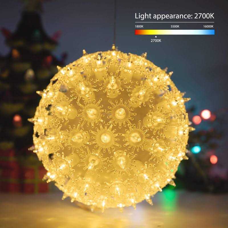 Starlight sphere – 6” size starlight ball lights dotted with 100 mini bulbs with rational spacing, clear lighting color, steady on, creating a realistic visual enjoyments, specially during operating at night. Come with gift box, an ideal and great gift for family, friends, relatives, colleague, co-worker, loved one or yourself Unpacking tips – Note: A strand of transparent slim lifting rope for hanging is placed among the mini bulbs of the light up Christmas ball lights, for easy taking it out, pull out some crystal ornaments around the mini bulb directly, then install them back again Note:The AC adapter should be protected from rain when hanging outdoor Easy replacement – 2 spare replacement bulbs and fuses for this lighted Christmas sphere included, take out the bulb crystal surrounding, then pull out the bulb from bulb fixture, plug in a new one with proper force. Slide out the fuse chamber cover toward two blades and take out the burnt-out one, install the new one correctly and close the cover. Plug in and try working Magic application – When there is Christmas ball lights, there is shiny mood. Wonderful outdoor Christmas sphere lights for house, festival and commercial decorations. Such as home, living room, bedroom, porch, yard, bistro, pub, cafe, hotel, mall, New Year, Halloween, birthday, theme party, wedding, evening party, ball party etc, creating an atmosphere of perfect wonderland Certified plug – UL certified plug with built-in fuses provides the steady current during for steady and long term operation br BRIGHTOWN 6 INCHES LIGHT BALL, PERFECT CHRISTMAS DISPLAYING AND AFFORDABLE! br br br Wish you happy and a pleasing mood in this coming Christmas holiday. Are you still boring about searching the appropriate and fascinating Christmas lights? br Don’t worry, the creative ball lights is just the right one for you! br br NOTES: br br 1. DO NOT install while plugged in. br 2. DO NOT secure cords with staples or nails. br 3. If changing to a new location, unplug before installation. br 4. Check the production condition before operation. br 5. This item is not a toy, keep away from children, kids, toddlers. br br SPECIFICATIONS: br br Bulb type: LED br LED bulb quantity: 100 pcs br Lead cord length: 30 inches br Working mode: steady on br Lighting color mode: warm white br Cable and plug color: white br Power cord type: 22 AWG br br Package Includes: br br 1 x 100 LED bulbs sphere lights br 2 x Replacement bulbs br 2 x Replacement fuses br For Fabulous Christmas Decorative Spherical Lights, Go Brightown Lighting System! SELECT and ORDER NOW!