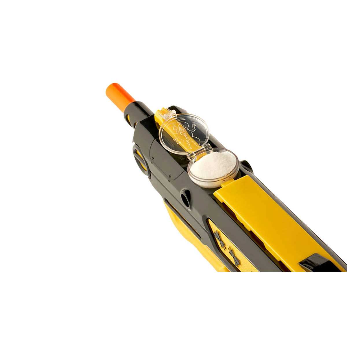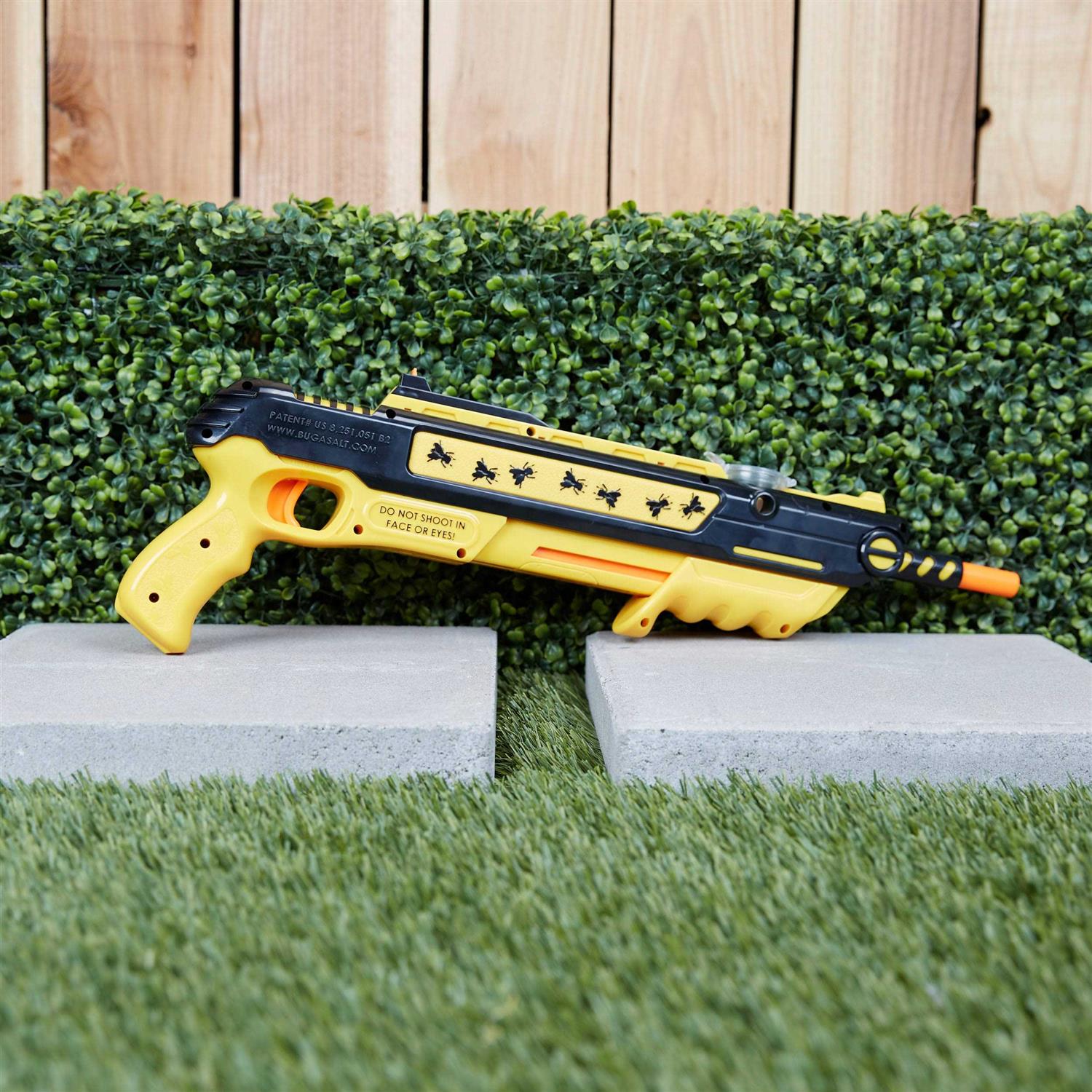 Reverse Yellow 2.5 This patented salt shooting, insect eradication device will decimate the common housefly, lantern flies, and other soft-bodied pest insects on contact. Uses ordinary table salt as ammo! Improved sighting on the 2.5 results in better accuracy to decimate mosquitos, roaches, moths, and poisonous spiders. Re-Engineered salt shooting internal mechanism allows for greater reliability, durability, and lasting power. Smoother spring on the cocking mechanism makes for easy operation. Automatic safety (resets every time) is recommended for those with small children or pets in the home. Non-toxic, accurate within three feet, and no batteries required. For use by responsible adults only.