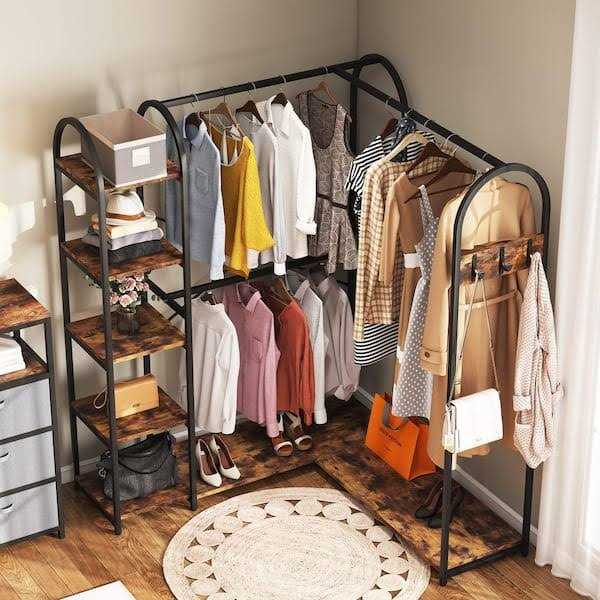 BYBLIGHT Carmalita Rustic Brown and Black L-Shaped Corner Garment Rack Closet Organizer with Storage Shelves and Coat Rack