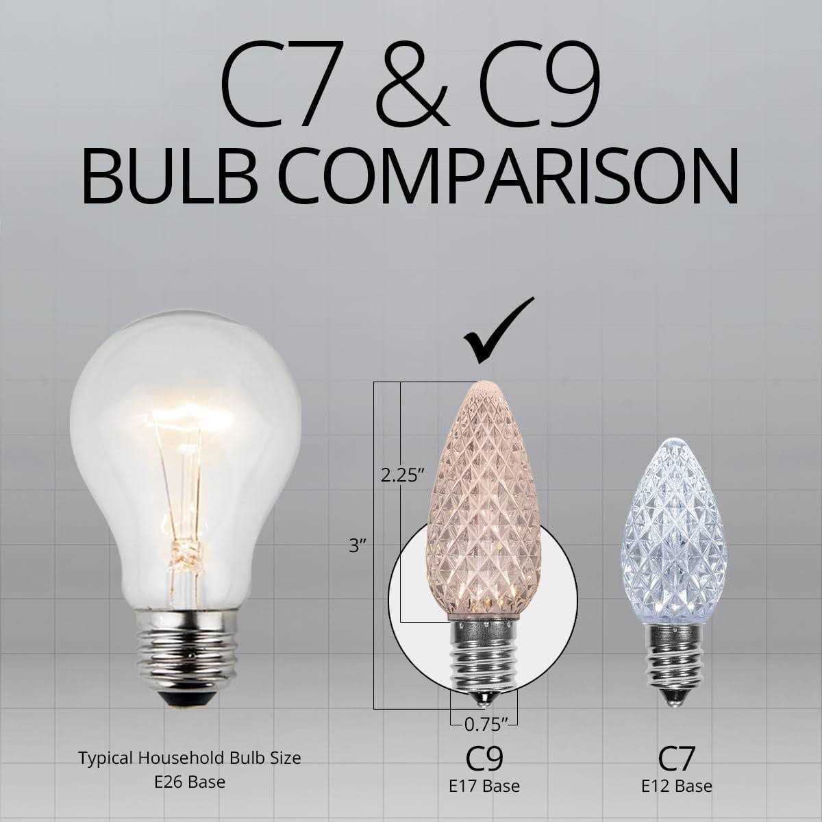 Clear bulbs are the most popular of light colors, casting a brilliant warm glow over parties and events while inviting relaxing conversations.Warm White C9 LED bubs, steady lights. Diamond faceted bulb designs reflect a spectacular light and color halo. Bulbs are rated for up to 60,000 hours of life, which means great looking bulbs that last for years. Nickel bases prevent corrosion, which means bulbs last longer and require less maintenance. LED bulbs draw up to 90% less power than incandescent bulbs, allowing you to safely make longer runs of light while saving time and energy. Reduce greenhouse gases by choosing environmentally friendly lighting that saves on power. Bulbs only, light stringer sold separately. Use with E17 – Intermediate stringer. Indoor / Outdoor use.
