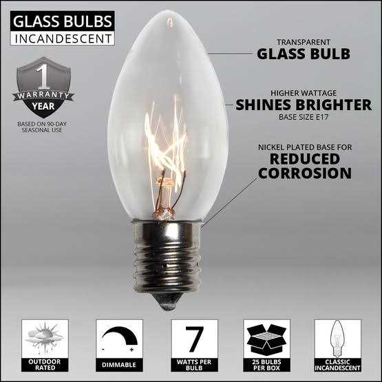 Clear C9 Christmas bulbs, 7 watt, E17 – Intermediate base. Commercial grade bulbs with average lifetime of 3,000 hours. Nickel plated bases prevent corrosion and improve connectivity, saving you time and money. Transparent bulbs allow light to shine from a visible filament. C9 bulbs measure over 2.5 inches from base to tip. Use with C9 strings, sold separately. Indoor / Outdoor use.