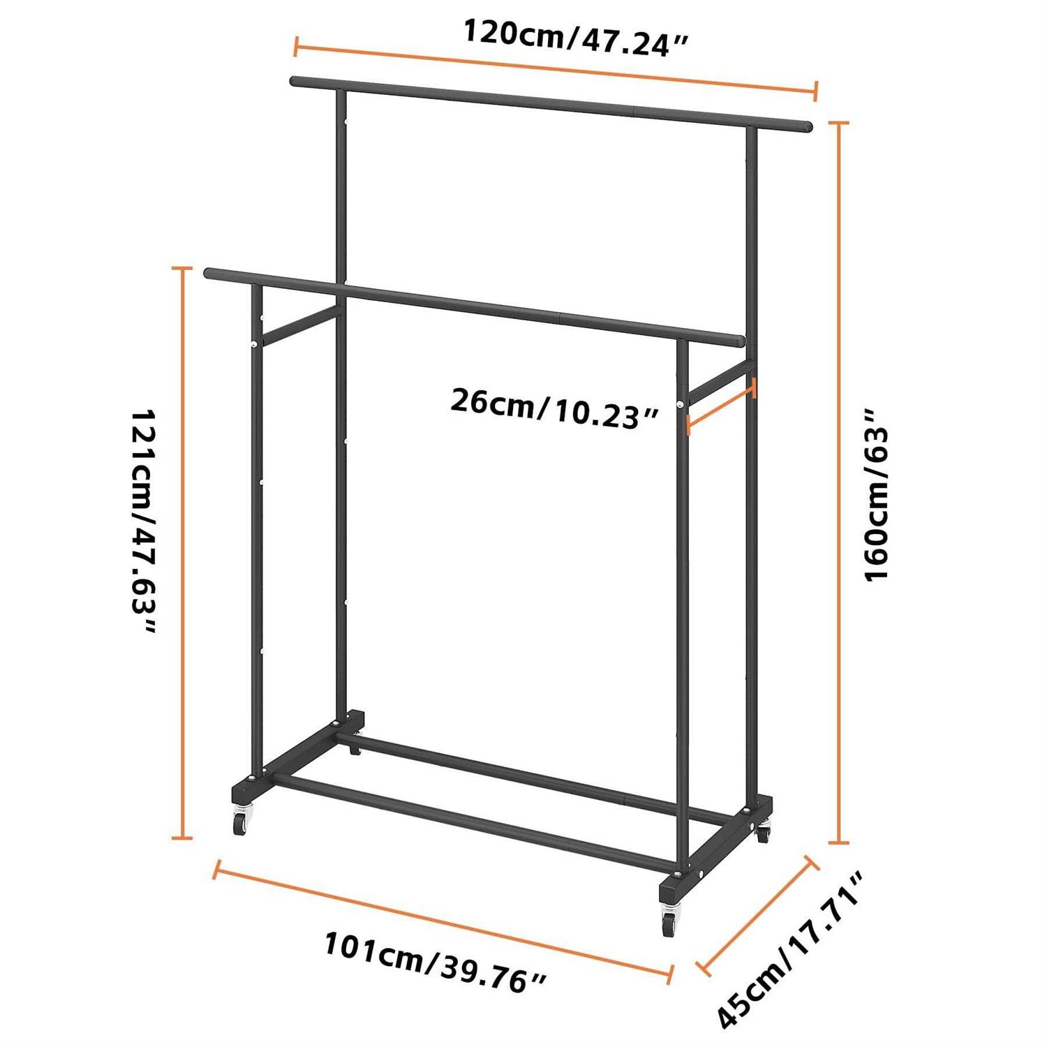 【Large Storage Space】- Double rod can meet different length of clothing. The bottom shelf can also put multiple pairs of shoes, but also can put blankets, storage bags and other items. So that the daily organization is more orderly. 【Strong & Durable】- The hanging bar is strong and durable. The whole bar can be hung and placed all kinds of clothing. Support rods on both sides not only make the clothes rack more stable, but also provide storage space for scarves and towels. 【Move or Stay】- The 360° rotating wheels make it easy to move this hanger anywhere with just a gentle push, and the wheels can be braked in place to lock it in place when stability is needed. 【Modern Design】- Unique garment design, suitable for cloakroom, porch, living room, bedroom, balcony, office and other places. Simple and versatile, will not make mistakes. 【Convenient Installation】- The clothing rack is easy to install, the instructions are simple to understand, and equipped with installation tools. Are your clothes still hanging on the bench? Don’t let the bench grow out of your clothes, Calmootey hanger, a high value hanger, helps you organize your clothes easily. It’s perfect for expanding your closet, or as a spare open closet, adding extra hanging storage, mass storage, and keeping your room organized. br br Advantages: br — Multi-functional structure with both hanger and shoe rack for easy storage of your favorite shoes, clothes, bags, etc. br — It’s super easy to assemble and move! The cardan wheel at the bottom rotates 360 degrees, and it can be easily moved and secured to suit your needs. The bottom grid racks allow for shoes, storage bags and more to create additional storage space. br — The clothing rack is light, easy to move and easy to clean. br — The appearance is simple and versatile but not lack of versatility, suitable for bedroom, living room, balcony and other places, in every corner of the home shining, also suitable for office and other places. br br Product parameters: br Short rod size (L * W * H):39.76″x 17.71″ x 47.63″/101cm x 45cm x 121cm br High rod size(L * W * H):39.76″x 17.71″ x 63″/101cm x 45cm x 160cm br Package weight: 3.9kg br Material: Metal br Color: Black br br Contents of the package: br — Operation manual * 1 br — Clothes rack * 1 br — Wrench * 1 br