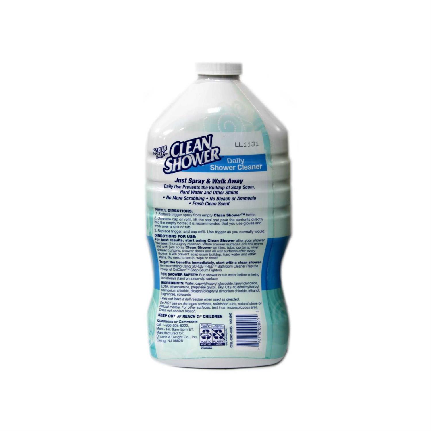 Keep your tub and shower spotless without all the work with Clean Shower Daily Shower Cleaner Refill, 60 fl oz. This powerful cleaner prevents soap scum, hard water build-up and mildew stains from forming, with a mild formula that’s never tough on surfaces. Clean Shower’s crafted without bleach or ammonia-free formula, without harsh abrasives that can scratch porcelain, glass, chrome or ceramic materials. The cleaner goes to work on contact, eliminating the need for scrubbing. Daily shower spray refills make it easy to keep your bathroom clean. To use, simply pour contents of the refill container into the original Clean Shower Daily Shower bottle and replace trigger sprayer. Just spray and walk away while it cleans for you. For best results, apply the solution onto all wet surfaces, such as tile, curtains, glass doors and tub surfaces.