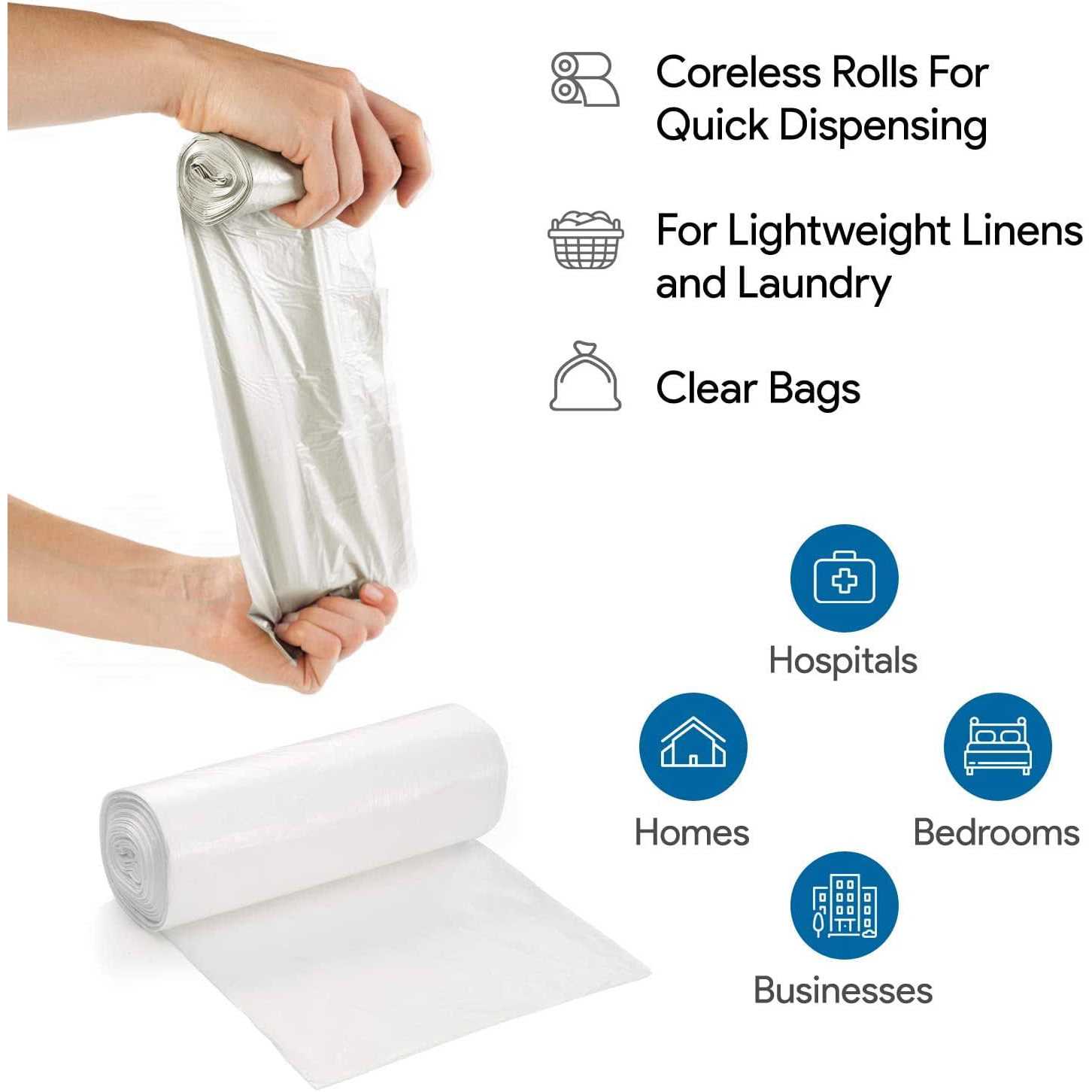 Features: THIN HIGH DENSITY BAGS: These are thinner, more light weight bags that are made with 8 micron thick plastic, compared to thinner 6 micron industry standard. Designed to handle light waste and trash, they are garbage and recycling bags. PERFECT SIZE: These bags fit six, seven, eight, nine and ten gallon bins. Measuring 24″ x 24″, they’re perfect for small & medium sized garbage bins, for bedroom, bathroom and office trash cans. MULTI USE: Not just for your office or home wastebasket, these bags can be used for laundry, storage, linens and other lightweight items. Protect from dust and dirt and keep your stuff covered and clean. FOR HOME & BUSINESS: Perfect for small bins at home, they are great for industrial, hospital and hospitality use. The coreless rolls are compact and great to leave in the bin to replace the bag quickly when it is full. VALUE & BULK SUPPLY: There are 50 waste basket liners per roll. Package Dimensions: 6.6 x 5.0 x 2.2 inchesEAN: 0708176144053