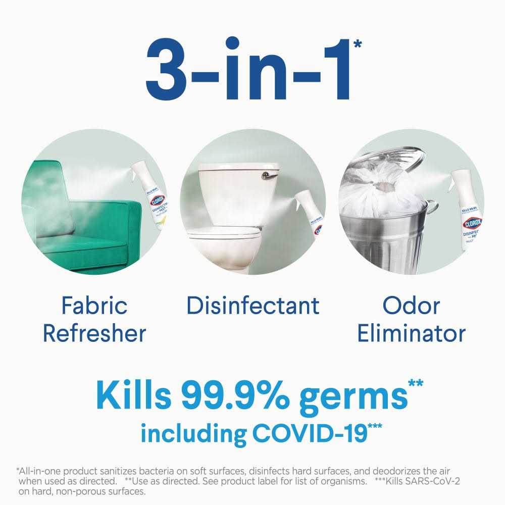 Disinfect germy surfaces throughout your home with Clorox Disinfecting Mist. This multi-surface disinfecting spray kills 99.9% of bacteria and viruses, including the virus that causes COVID-19. Protects your home from the spread of germs on surfaces, including during cold and flu season, by spraying high-touch surfaces like doorknobs, countertops and faucets. Continuous sprayer creates a fine mist that evenly coats hard non-porous surfaces and disinfects without wiping. It even sanitizes soft surfaces like couches, car interiors and bedding. Stops odor-causing bacteria growth for up to 24 hours on non-food contact surfaces and deodorizes the room with a pleasant scent. Save plastic and help keep waste out of waste streams by using the reusable sprayer system, designed to be reused with our Clorox Disinfecting Mist Refill Bottles in the same scent. Aerosol-free and bleach-free, Clorox Disinfecting Mist is the future of disinfecting. Kills E. Coli, Staph, and SARS-CoV-2 (Human Coronavirus), on hard non-porous surfaces. Kills Klebsiella pneumoniae and Staph on soft surfaces.