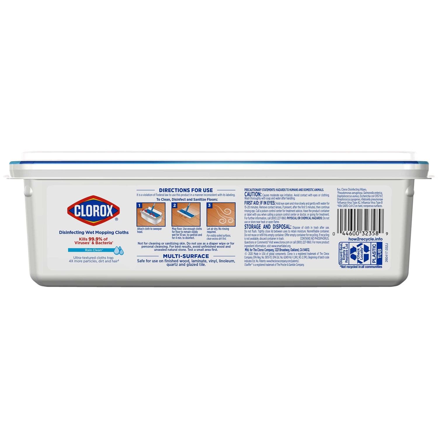 Clorox Disinfecting Wet Mopping Cloths bring the trusted cleaning and disinfection power of Clorox to your floors. Clorox disinfectant wipes for floor cleaning eliminate 99.9% of viruses and bacteria, including COVID-19 Virus and leave behind a hint of fresh, clean scent. These Clorox wipes for mopping are bleach free and feature ultra-textured fabric that traps 4X more particles, dirt and hair and prevent bacteria growth for up to 24-hours. Use these disinfecting wipes on finished wood, laminate, vinyl, linoleum, quartz and glazed tile. Pseudomonas aeruginosa, Salmonella enterica, Staphylococcus aureus, Escherichia coli O157: H7, Streptococcus pyogenes, Klebsiella pneumoniae. Influenza Virus Type A2, Influenza Virus Type B. Kills SARS-CoV-2 on hard, nonporous surfaces. Versus Clorox Disinfecting wipes. Prevents odor causing bacteria on non-food contact surfaces. Color: White.