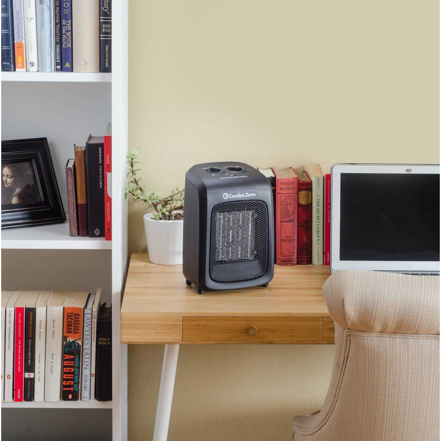 The Black Comfort Zone 1300W 45 degree Oscillating Ceramic Heater CZ446WM helps you keep your living space warm and hospitable all through the cold weather months. It has an adjustable thermostat with 3 settings, High Heat, Low Heat, fan for all seasons that allows it to maintain a stable temperature so that it continuously delivers cozy and comfortable heat. This black ceramic heater has a safety tip-over switch and a high-limit safety fuse to give you peace of mind, especially when leaving it on for extended periods of time. Its fan forces out the hot air it creates and evenly distributes it around the room. Its small size is ideal for your bedroom, den, office or dorm room. Powerful Heat from a Compact Unit, 1300 Watt, 4437 BTUs multi-purpose Oscillating Ceramic heater fan with power indicator light and stay cool body with molded handle.