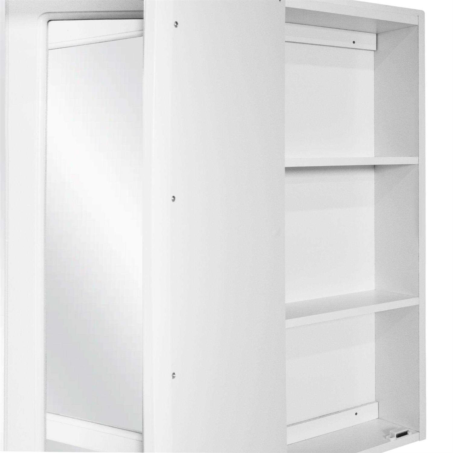 The Design House 531459-WHT Concord Tri-View Medicine Cabinet Mirror features a durable white gloss finish dual shelf design and concealed hinges. The cabinet doors glide open revealing 2 stationary shelves to hold shampoo medicine makeup and other toiletries. This cabinet is built to withstand the moisture and humidity from your shower and will not chip or stain. Use this mirror for shaving or applying makeup in the morning.