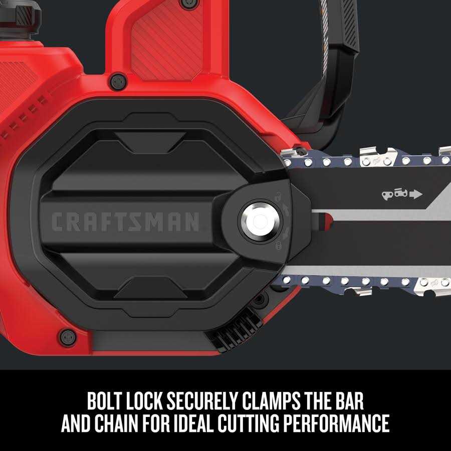Chainsaw features a powerful motor helping the user power through cuts. This unit is built with the user’s needs in mind; the auto-oiling feature eliminates the inconvenience of priming. The oil tank built in window helps the user know when it is time to refill. Once the task is complete, conveniently store using the integrated Versatrack hook with the Versatrack system (sold separately).