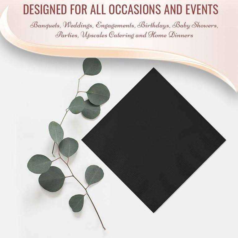 These high-quality disposable paper cocktail napkins measure 5″ by 5″ when folded and 10″ by 10″ unfolded. They match perfectly with the rest of your black decor, from plates to tablecloths, to allow you to create the sense of elegance you want on your important event. napkins, Creative Converting, 600 Napkins, Black Cocktail Beverage Napkins, fancy dinnerware, elegant dinnerware, disposable dinnerware.