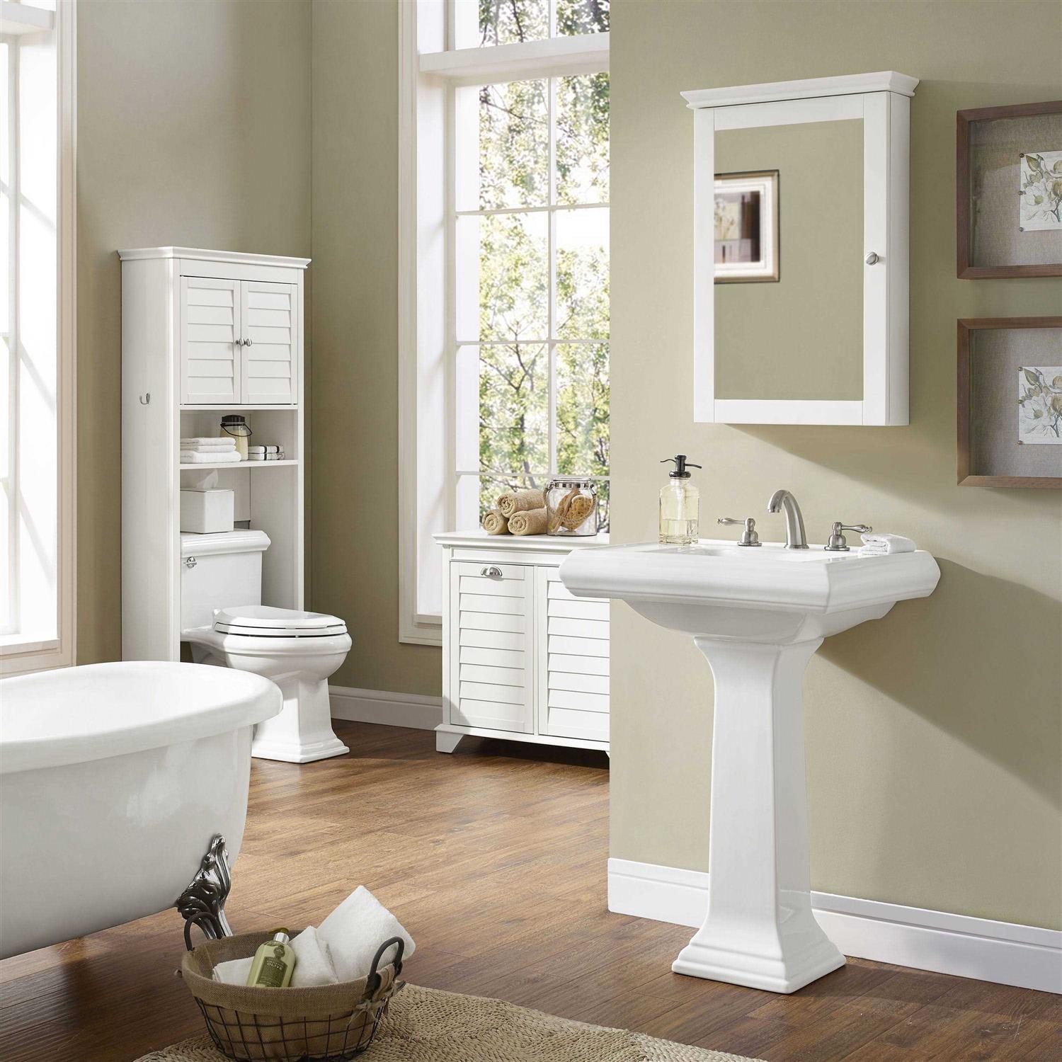 Organize bathroom essentials in this mirrored wall cabinet featuring molded trim. This sleek white cabinet has four shelves inside for holding toiletries and medicines out of sight, helping you keep your bathroom space tidy and neat. Dimensions: 28″H x 19.25″W x 5.25″D.