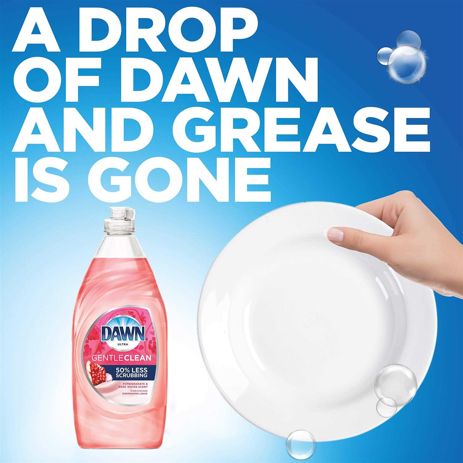 Easy on hands, tough on grease 50% less scrubbing (vs. Dawn non-concentrated) Exotic Pomegranate & Rosewater scent Just because a dishwashing liquid is tough on grease doesn’t mean It has to be hard on your hands. Get the great grease-fighting power of Dawn in a soap that is easy on skin. When you want a thorough clean that’s easy on hands, tough on grease, get Dawn Gentle clean dishwashing liquid Dish Soap. With 50% less scrubbing (vs. Dawn non-concentrated), Dawn dishwashing liquid Dish Soap works harder so you can get back to spending quality time with your family. Dawn dishwashing liquid Dish Soap is Americas #1 dish liquid (based on sales).