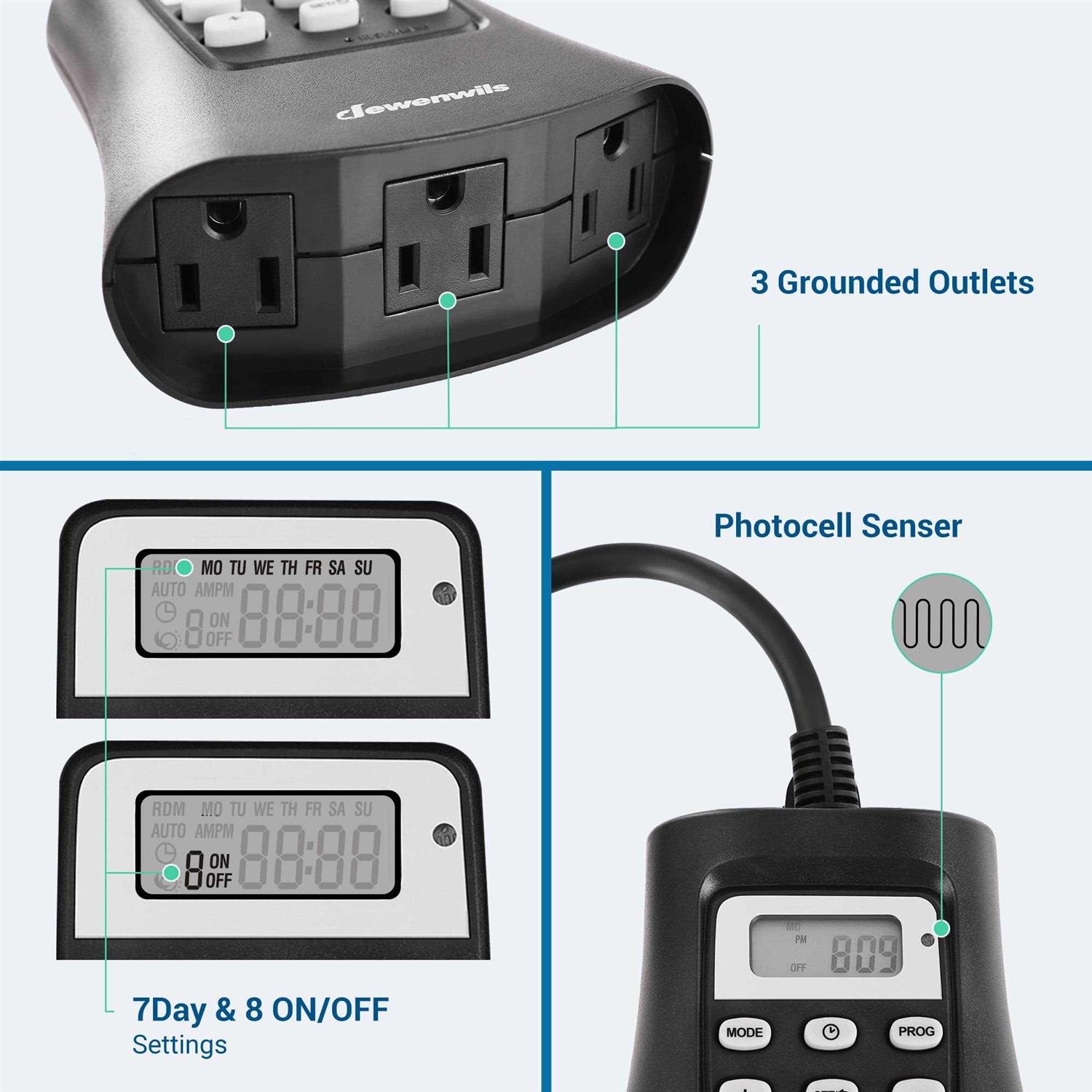 The DEWENWILS Outdoor Digital Timer for Lights is a highly functional and reliable device that is perfect for outdoor use. Its 7-day programmable feature allows you to set your lights to turn on and off automatically for up to one week, providing convenience and peace of mind. Equipped with three grounded outlets, this timer can handle up to 15A and 1/3 HP, making it ideal for landscape string lights and other outdoor lighting fixtures. Its UL Listing ensures safety and durability, making it a dependable choice for all your outdoor lighting needs. Featuring a digital display with easy-to-use programming buttons, the DEWENWILS Outdoor Digital Timer is incredibly user-friendly. You can easily program your desired switch times and adjust them as needed, providing flexibility and convenience. Designed for outdoor use, this timer is built to withstand the elements and features a rugged and weather-resistant housing that provides long-lasting durability. Its compact size makes it easy to transport and store, while its versatile design allows you to power multiple outdoor light fixtures simultaneously. In summary, the DEWENWILS Outdoor Digital Timer for Lights is a highly functional and reliable device that is perfect for homeowners looking for an easy-to-use and efficient way to control their outdoor lighting. With its 7-day programmable feature, 3 grounded outlets, and durable construction, this timer is a great choice for landscape string lights and other outdoor lighting fixtures.