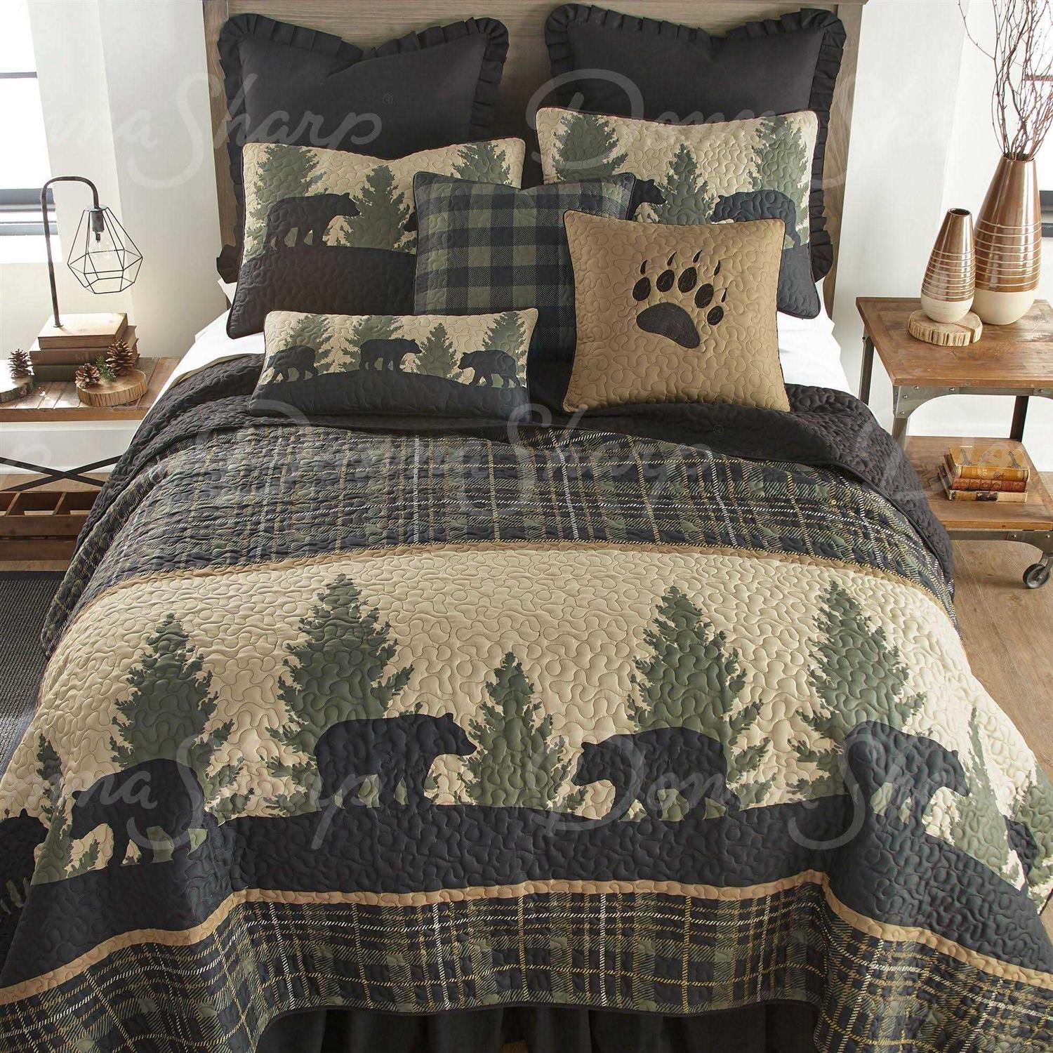This soft and quilted Ultra Comfort Collection, bedding ensemble is a beautiful addition to lodge and country decor as it features a row of printed black bears and pine trees, surrounded by a large, rustic plaid backdrop. Colors include green, khaki, warm gold, caramel and black. Our coordinating shams, throw, valance and accent pillows help to carry this quilted bedding collections theme throughout your room.