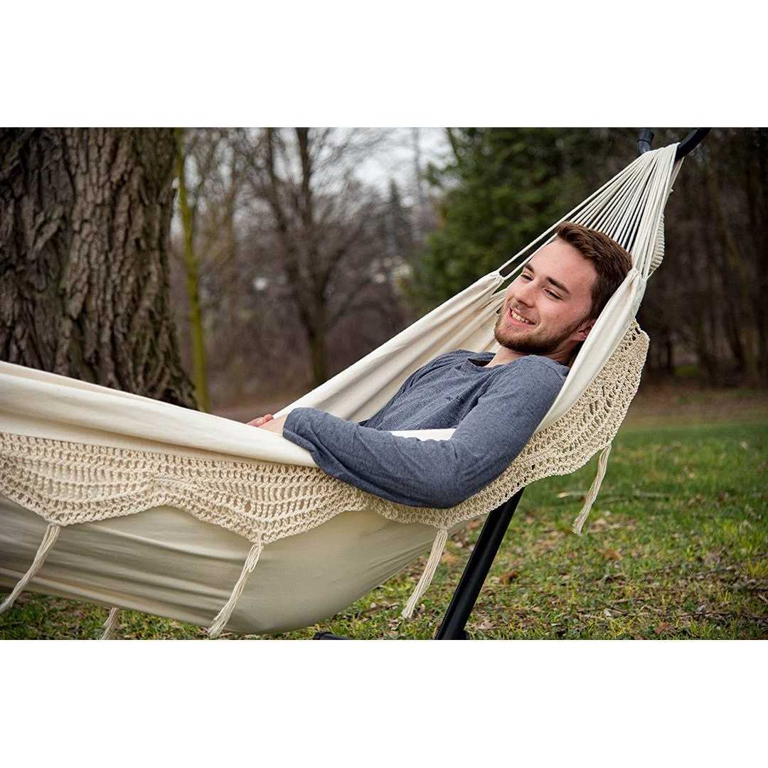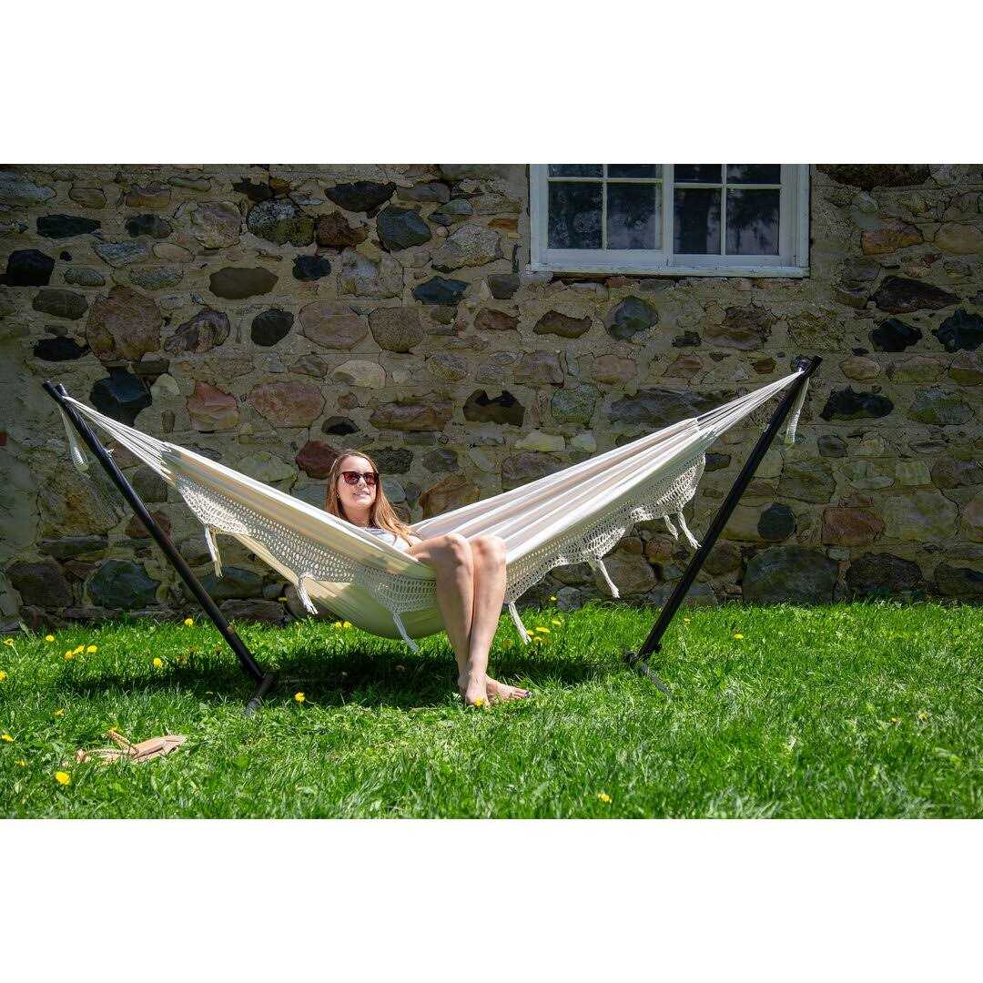 This universal hammock stand with a double hammock is the favorite and best-selling combo. The double hammock is made with a 100% tightly woven cotton cloth which allows for a soft and airy breathable fabric. Polyester end strings are used to ensure a long-lasting hammock. The hammock stand is constructed of heavy-duty steel and assembles in minutes without any tools. The zinc-coated legs of the stand prevent rust and plastic caps are used on the ends of the steel tubing to create a soft finish. This means you can move your stand across your patio or deck without scratching the deck or stand. You will enjoy the freedom the stand provides by allowing you to set up your hammock wherever you desire and the premium carry bag included means you can now take your hammock and stand on the go.
