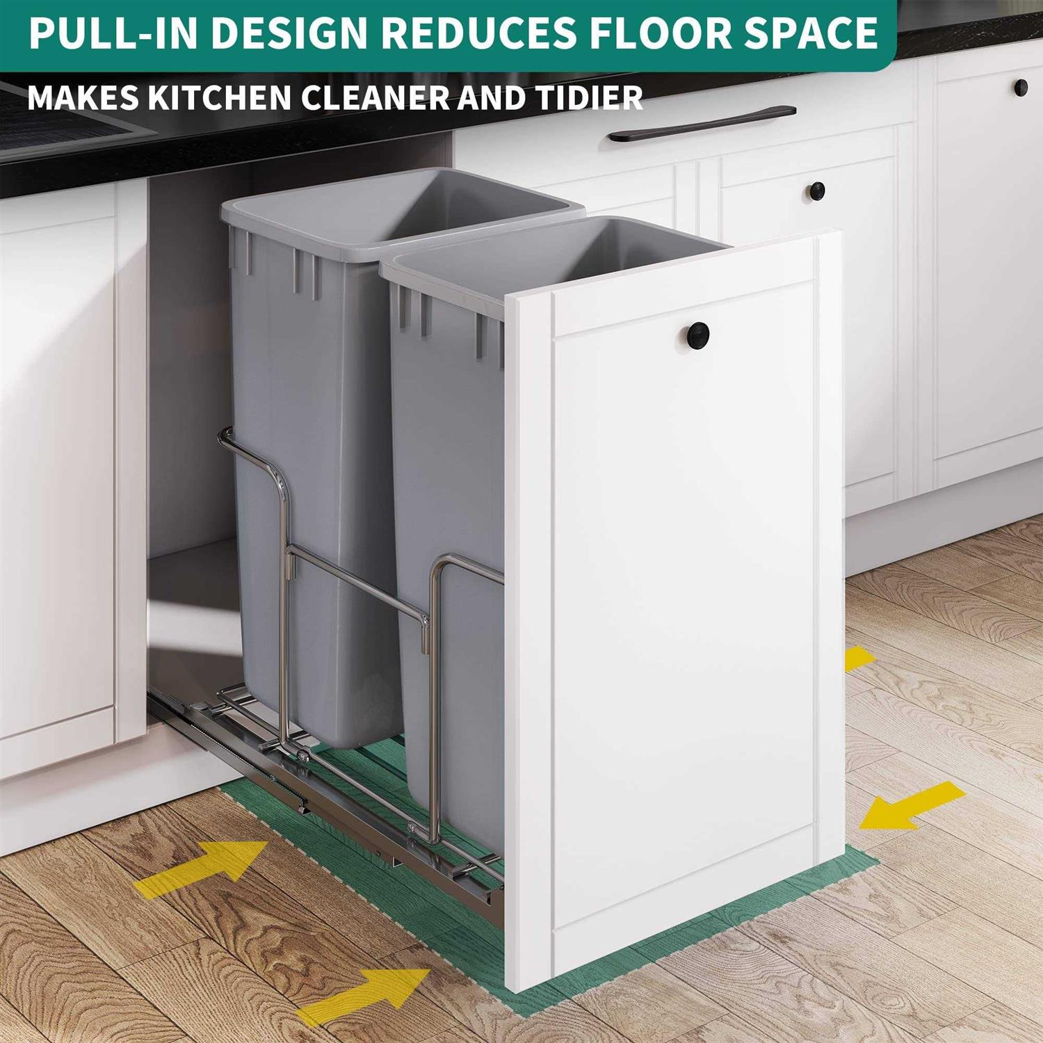 The minimum installation cabinet size is 21.1W x 25.8D x 29.5H (NOTE: Only for use under kitchen cabinets, not under the sink) DURABLE & ECO-FRIENDLY MATERIAL- The base of under cabinet trash can is made of high-quality steel panel and trash bin comes with eco-friendly plastic, chrome-plated surface is strong and durable, and load-bearing capacity is strong enough for your use GARBAGE SORTING & LARGE CAPACITY- The double bins design is convenient for garbage classification, and 43 QT large capacity is suitable for using in homes, hospitals and other places SMOOTH AND SILENT OPENING- The pull out trash can adopts damping rails which has great advantage at reducing noise and moving smoothly. REDUCES GROUND SPACE & SMELL- Trash can be pulled in to save much space and make your kitchen more clean and organized. Lid design can greatly reduce smell of garbage EASY TO INSTALL- Please measure dimensions carefully as our picture mentioned.