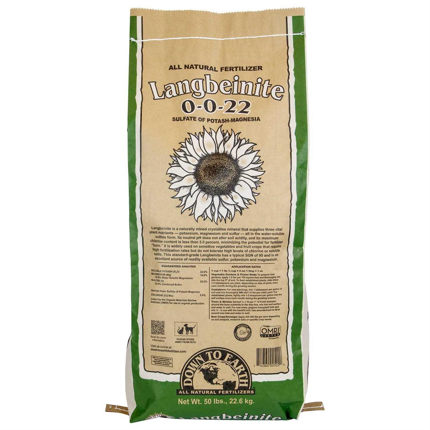 A unique 3-in-1 combination of Potassium Magnesium and Sulfur Langbeinite is a naturally occurring source of these three vital plant nutrients. Potassium is essential for high quality fruit Magnesium is required for the synthesis of chlorophyll and Sulfur is needed for enzyme activation. Contains 22% K2O 11% Mg and 22% S.