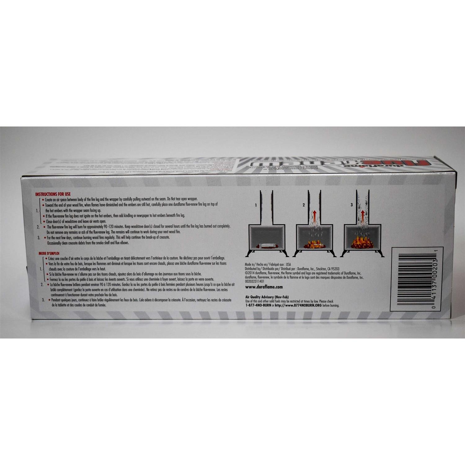Controls creosote buildup Destroys existing creosote formations Regular use makes chimney cleaning easier Duraflame Flue-Renew Log is treated with Safe-T-Flue Chimney Cleaner, which reduces soot and creosote buildup. Recommended for use in all wood-burning fireplaces and wood stoves. Use 1 log/month during burn season, or 1 log every 20-30 fires. Simply place log (in wrapper) in fireplace or wood stove and light wrapper. Log and wrapper will burn to ash. Each log is one application.