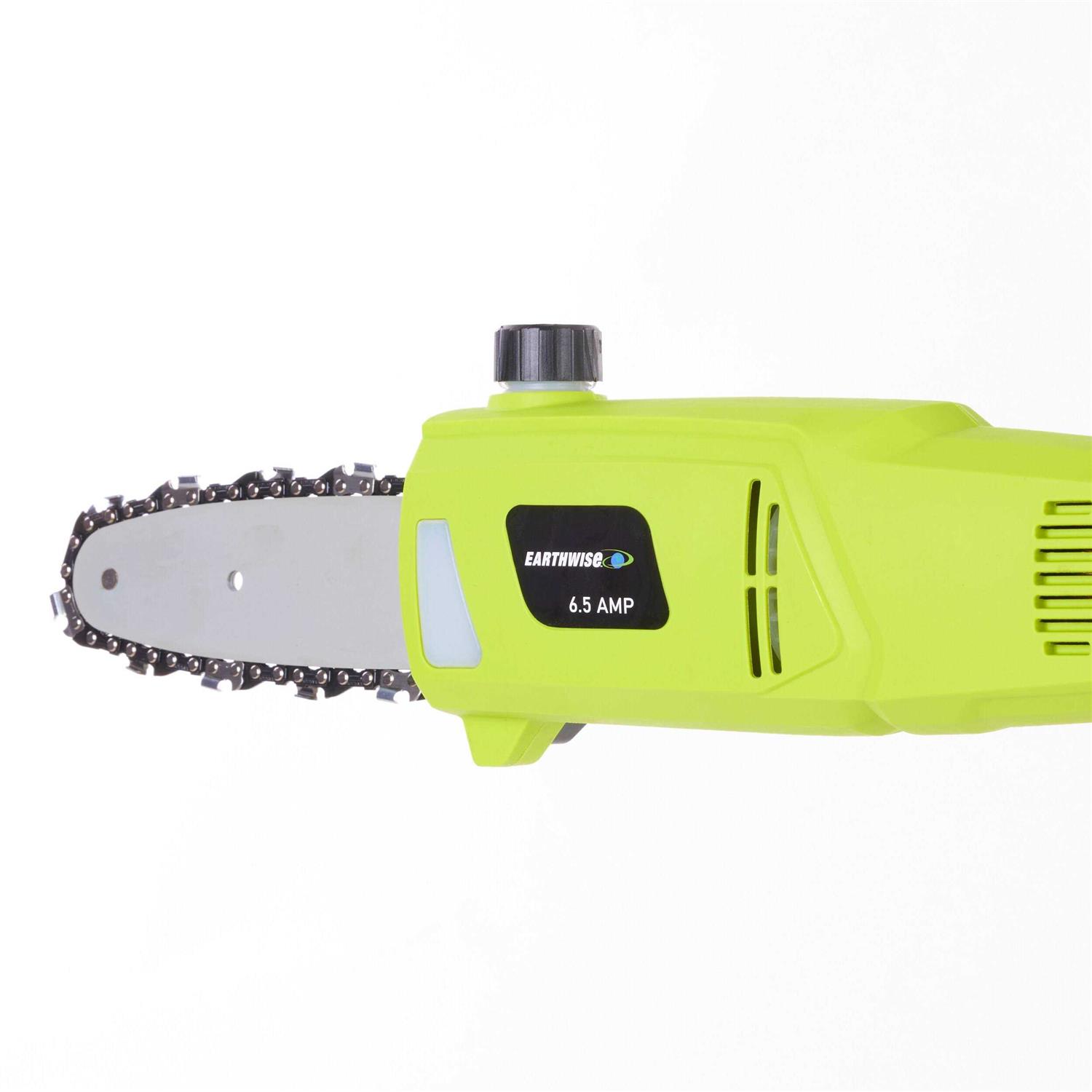 Earthwise electric corded pole saw takes trimming tree branches and hard-to-reach brush to the next level. At fully extended length this telescoping corded electric pole saw reaches, making this pole saw one of the longest pole saws available. The powerful 6.5 amp motor makes for quick, clean cuts while you stand safely on the ground. With the extended reach and power. This corded electric pole saw offers everything you need for trimming branches and limbs around the house. This corded electric pole saw features an automatic oiler system, oil level window, Adjustable cutting head and comfortable grips. Take the hassle out of your fall home and yd clean-up with this corded electric telescoping pole saw.