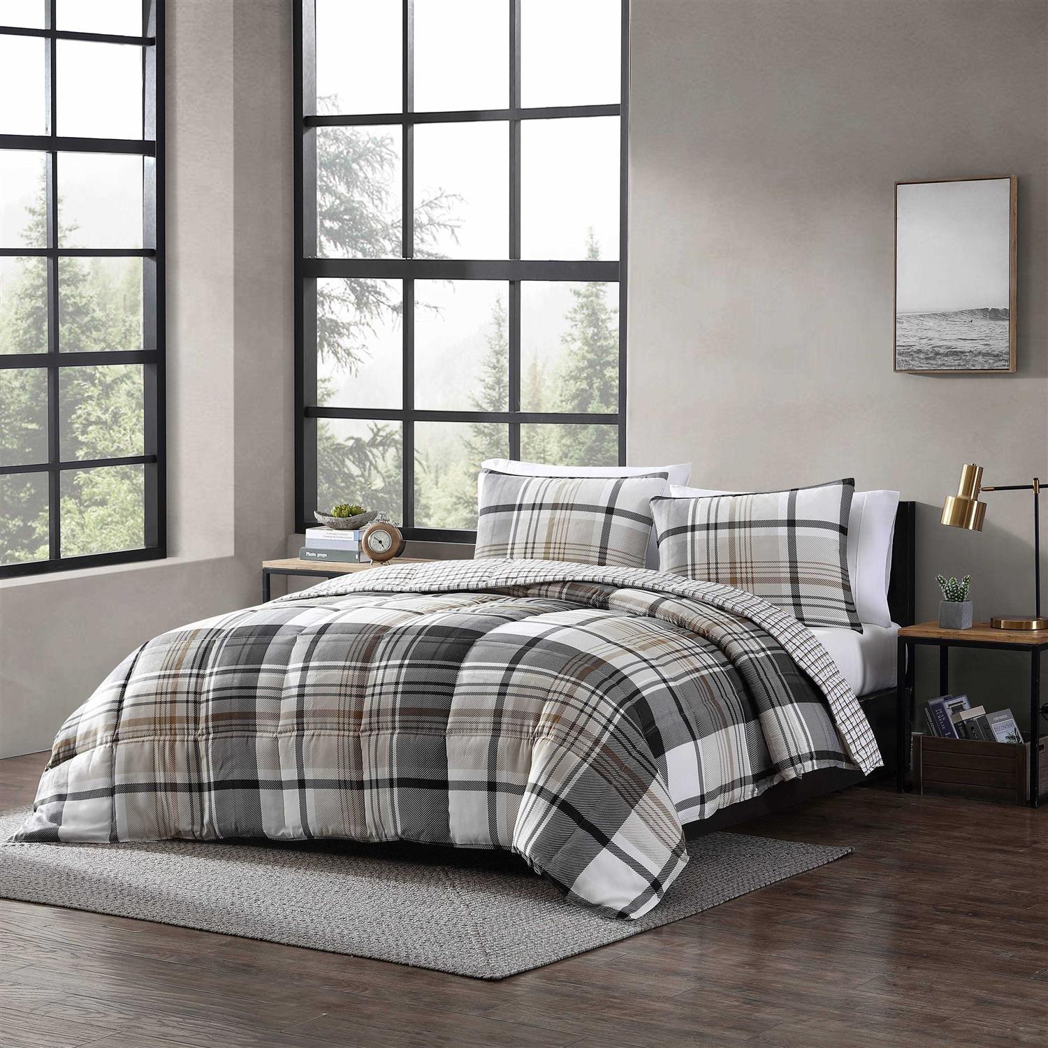 Snuggle up on those cold winter nights with the Normandy Plaid Black Comforter Set by Eddie Bauer. This comforter set is reversible to offer multiple styling options, and is made from 100% polyester and cozy microsuede. With oversized plaid on one side and a muted plaid on the other, this comforter will fit all of your styling needs. This set includes a comforter and one pillow sham. Machine wash, tumble dry low. Now a household name, Eddie Bauer is more than sports goods – it’s premium-quality gear, accessories, and clothing designed to complement the lives of those who love outdoor pursuits. Eddie Bauer’s home collection proves the company’s rugged, athletic spirit can be just as rewarding indoors, too.
