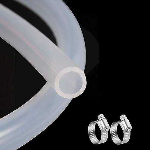 Pre-cut flexible silicone tubing. High quality, flexible silicone compound in compliance with FDA and 3A Sanitary Standards. USDA approved for meat and poultry plants. This extremely flexible, food grade silicone is suited for general low pressure industrial applications for the conveyance of chemicals, liquids, gases, and solids of suitable granular size, such as factory air lines automation machinery and pneumatic lines. Its many suitable uses include pumps, shiphons, filters, AC and HVAC tubing, drain valve connections, filters, plumbing, drip irrigation, ponds and gardens, beer brewing, wine making, and more. Lightweight, flexible, and crystal-clear, tubing provides excellent solvents, alkalis, and acids. Smooth inner surface for easy flow and easy cleaning. For your industrial, chemical, and agricultural supplies. Also available in 3 feet 10 feet 26 feet. Product Feature The clear silicone construction allows you to see through the flow of liquids inside. Food grade, odorless and tasteless, this tubing can accommodate a wide variety of liquids and gases. Clear tubing makes it easy to see flow of liquids inside. Can be used as a drainage line or for protective insulation. Material: Made of silicone material. Tips: Do not use with icemakers. In most cases, a proper Worm Gear Hose Clamp may help the slipping problem. Flexibility of rubber and clarity of glass. Resistant to acids, alkalis and manysolvents