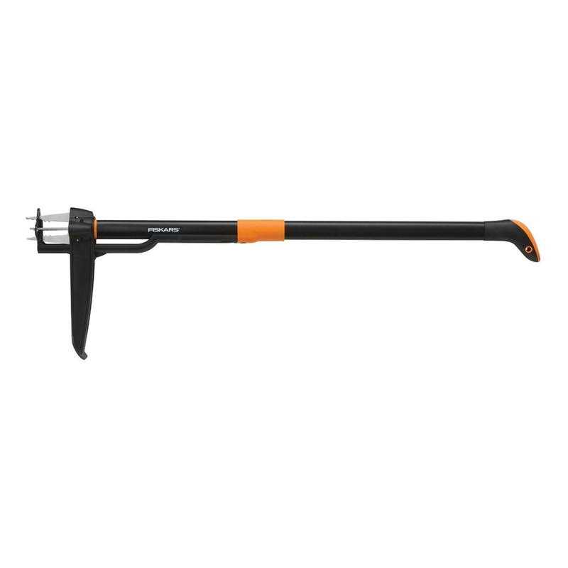 Fiskars 339950-1001. Features: Long handle eliminates sore knees from kneeling and back ache from bending and stooping. Offset handle design offers improved ergonomics to reduce wrist strain and enhance grip. Four serrated, stainless steel claws firmly grab weeds and roots for permanent removal. Redesigned foot platform is stronger, so you can step down confidently to penetrate tough soil. Viewing window integrated into the foot pedal makes it easy to see the weed for optimum claw placement and clean, complete removal. Easy-eject mechanism on the handle clears tool without forcing you to bend over and remove it by hand to make cleanup quicker and easier. Lightweight, hard anodized aluminum shaft provides easy maneuverability and lasting strength. Added peace of mind with a lifetime warranty.