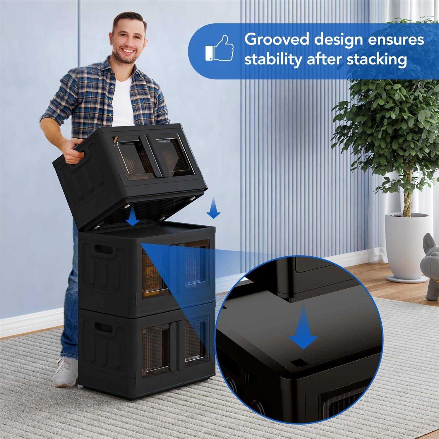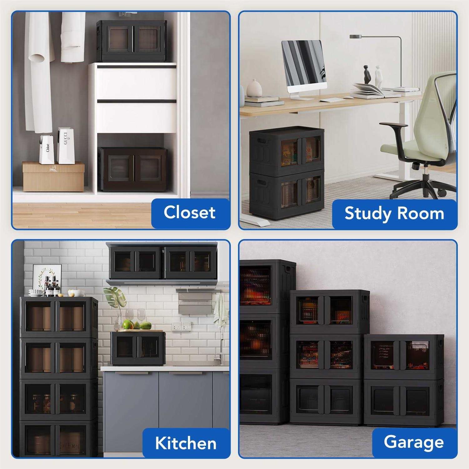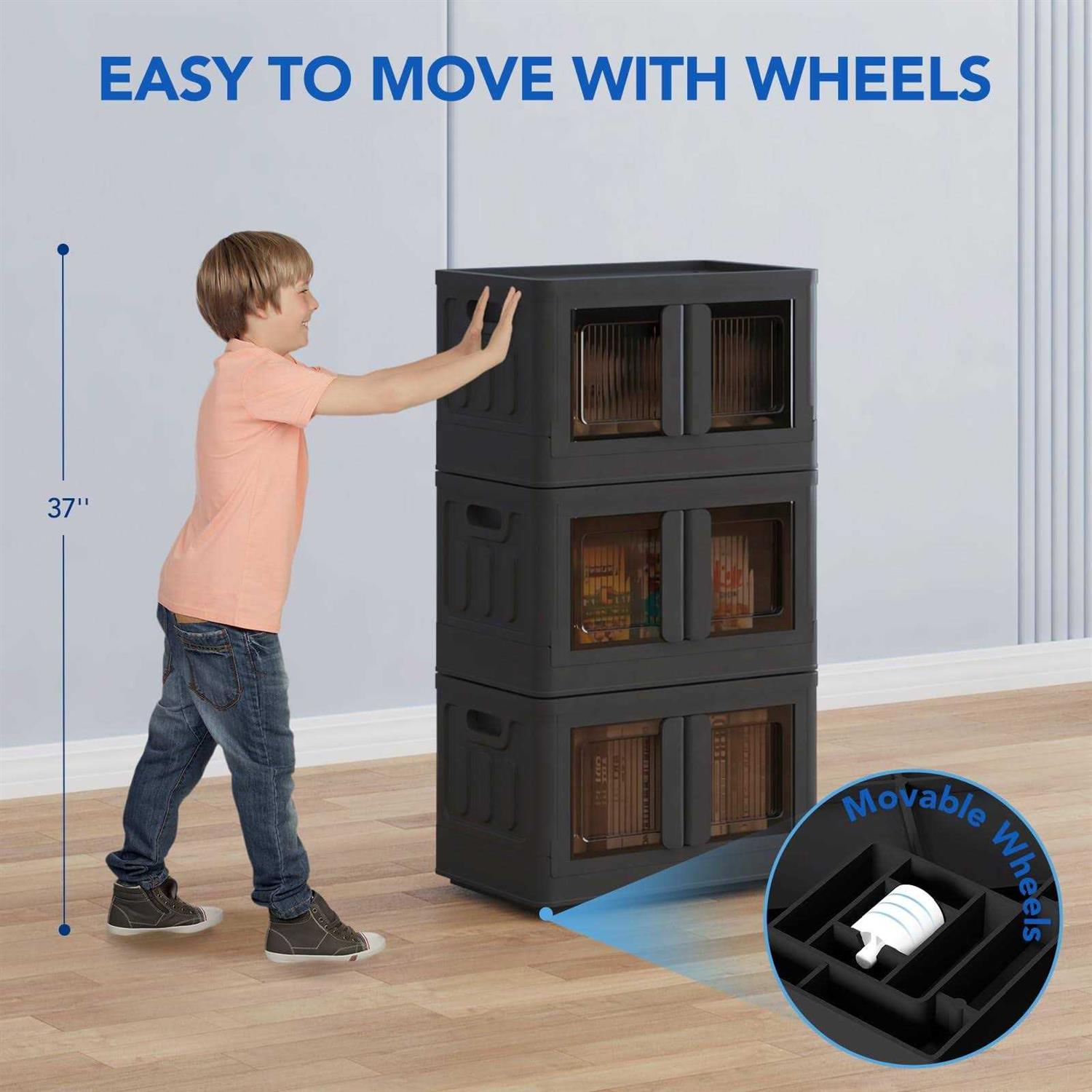 Fleximounts 8.4 Gal Collapsible Plastic Storage Bins, 3-Pack Stackable Storage Bins, Black Closet Organizers and Storage with Doors