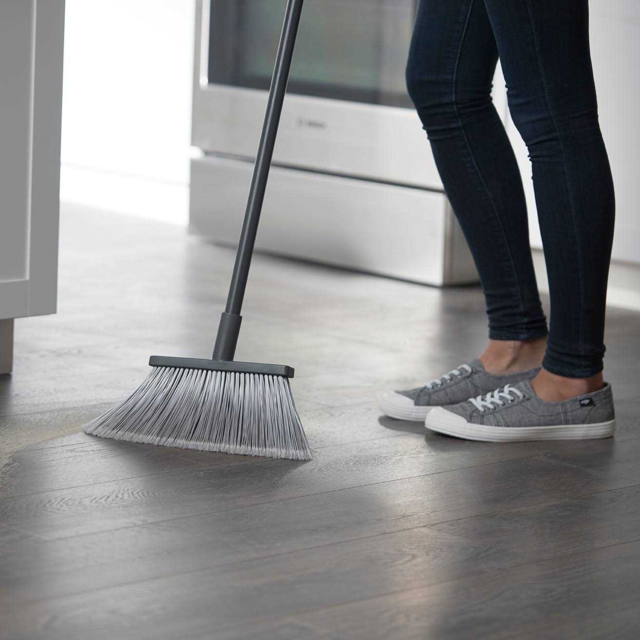 Perfect for everyday use Handle has a loop for easy hanging storage Fine bristles catch dirt and dust Tidy up your living space with an angled Floor Broom from Made By Design. This 53-inch broom features fine bristles that are perfect for sweeping up dirt, dust and debris, and the long handle is finished with a simple loop for hanging storage. The angled brush head is ideal for corners and hard-to-reach places, and the durable plastic construction stands up under regular use.