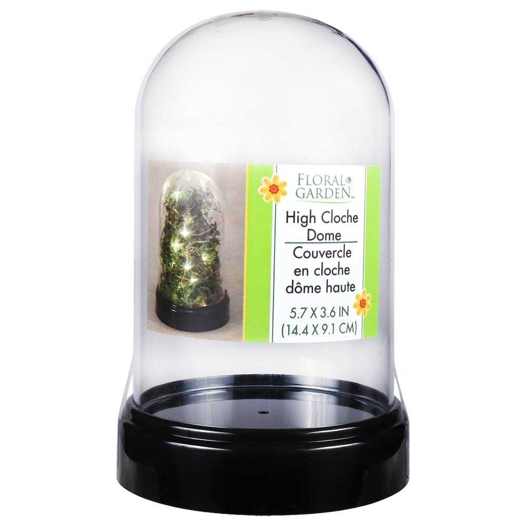 Craft Supply Plastic Cloche Dome 5.7 x 3.6 diameter-inch approx. Whether you’re creating a floral arrangement or displaying your favorite figurine, these Floral Garden Plastic High Cloche Domes are perfect for your home, office, or DIY craft! Standing 5.7-in. tall and measuring 3.6-in. in diameter, these plastic domes have black bases to match any color scheme.