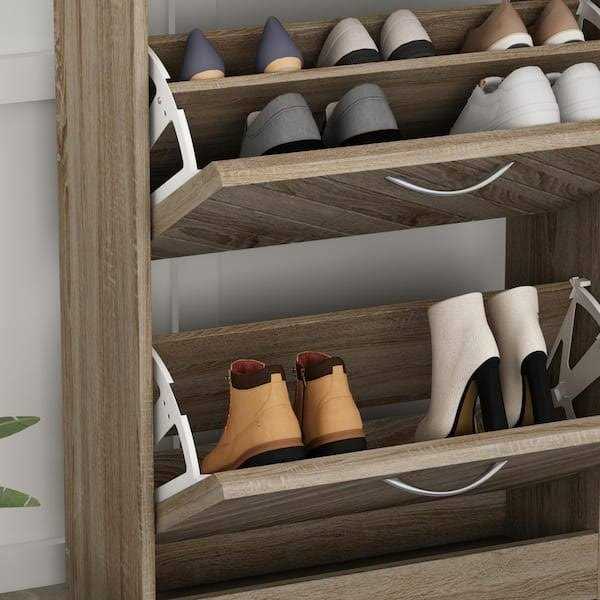 Still worried about the mess of your entryway with too many shoes lying on the mat. Features spacious pull down folding drawers, our shoe cabinet can exactly meets your space needs with 2 in. side divider components. With elegant clean color, smooth lines and classic fashionable design, it can reflect your great taste, add novelties and romance to your house. Color: Natural.