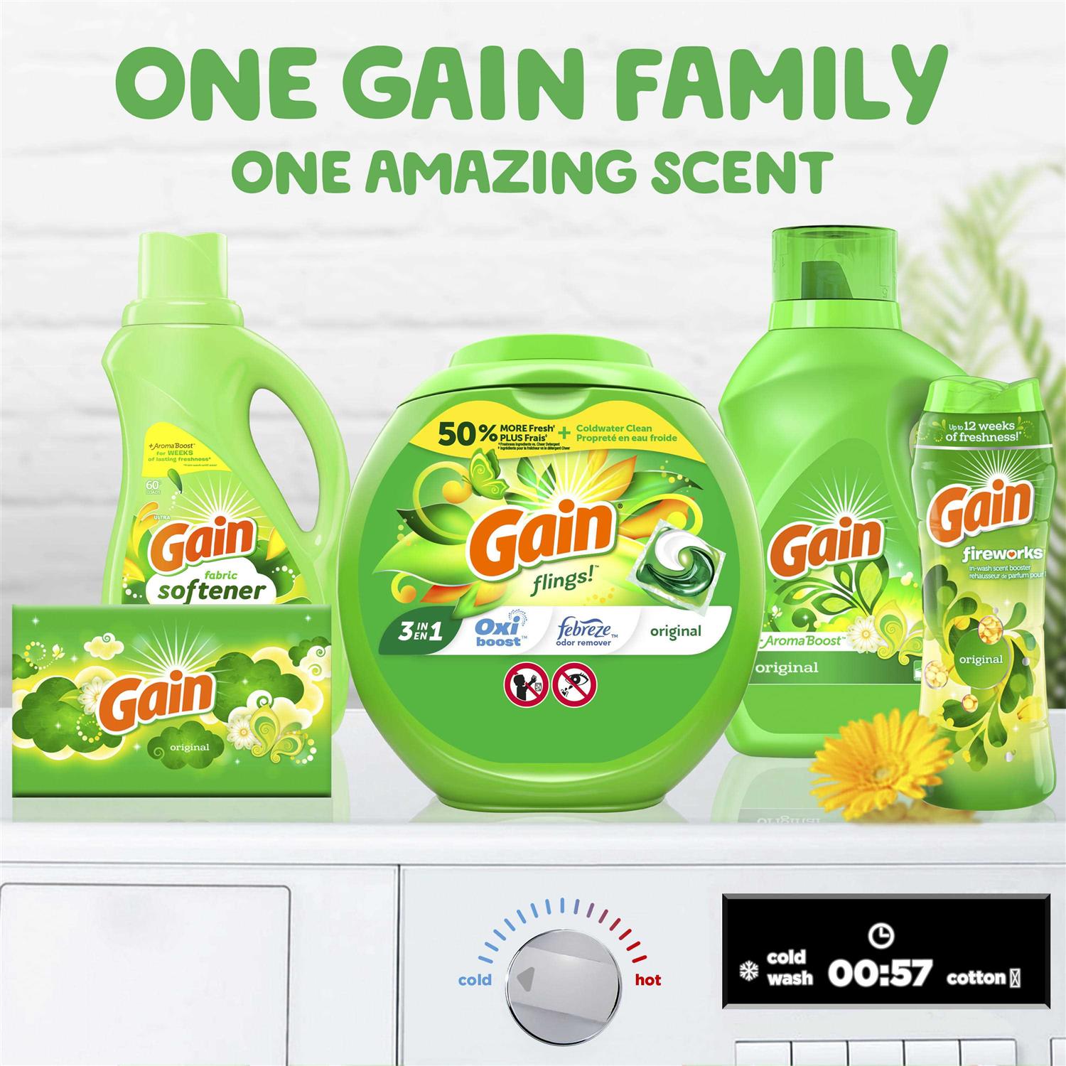 Detergent Pacs & Tablets by Gain. Details:Gain flings! laundry detergent pacs are packed with 50% more scent than Gain liquid laundry detergent. Armed with the stain-fighting power of Oxi and Febreze, they give you nothing but great, clean, amazing-smelling laundry. Use with any laundry set-up, because Gain flings! Pacs dissolve in both hot and cold water and are HE compatible. Gain’s refreshing Original Scent infuses your clothes with the fragrance of the green, clean, airy outdoors, so you’re always just one quick sniff away from the most invigorating scent experience known to humankind.
