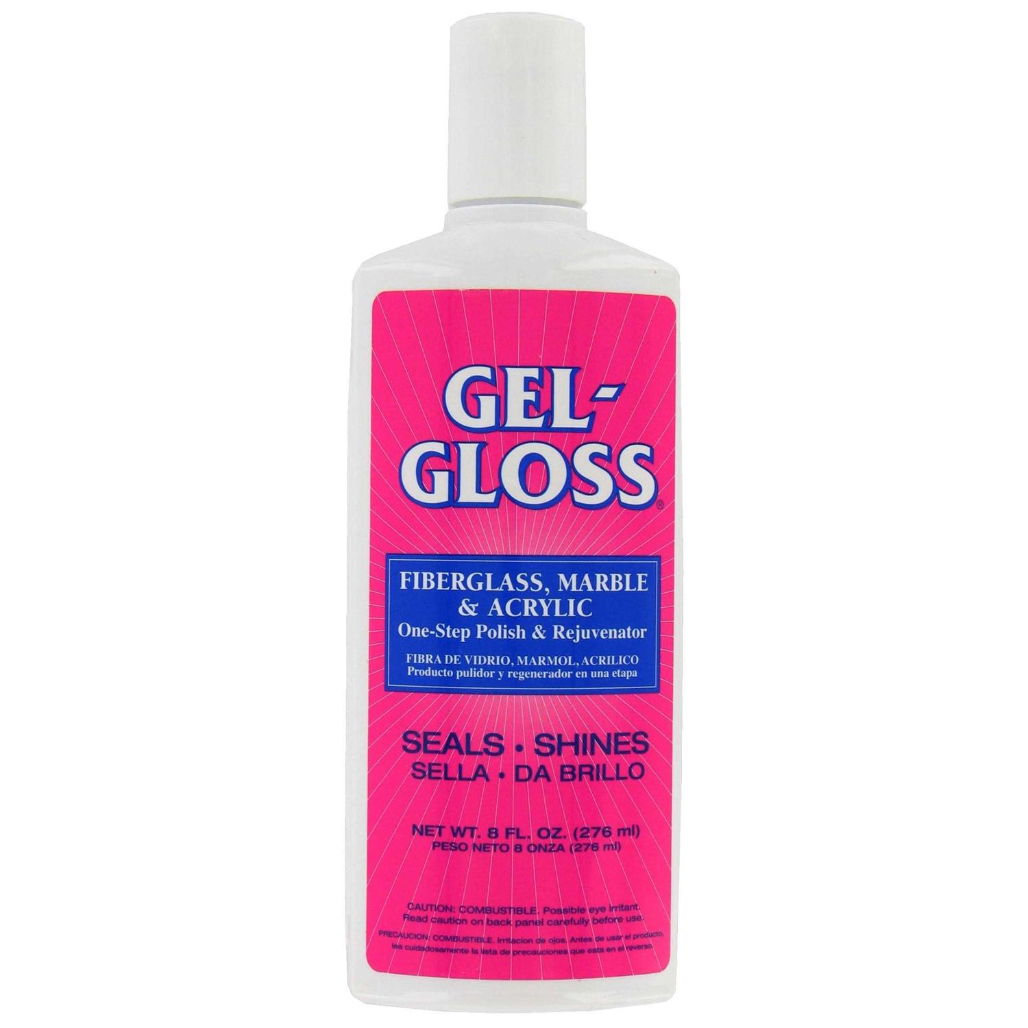 Most surfcare professionals and homeowners classify the Gel-Gloss products and company as the SurfCare Experts. “The Original” Gel-Gloss polish and protector was made at the request of manufacturers of fiberglass products and cultured marble vanities. It contains non-harmful abrasive agents that remove surfoxidation and light scratches, while leaving behind a protective carnauba wax coating. The Original Gel-Gloss polishes, protects and restores luster while providing a long lasting protective finish. It can also be used on acrylics, corian, porcelain, ceramic and stainless steel sinks. The Original Gel-Gloss works great on tubs, vanities, sinks, showers, spas and countertops and is safe on glass and ceramic cook tops. Not recommended for natural stone surfaces. Apply Gel-Gloss to dry surfaces with a clean dry cloth. Rub into surfand allow it to dry to a haze. Buff off haze to a brilliant luster. Model #GG-8 comes in a 8 fluid ounce bottle. 5″ L x 2. 5″ W x 7. 5″ H.