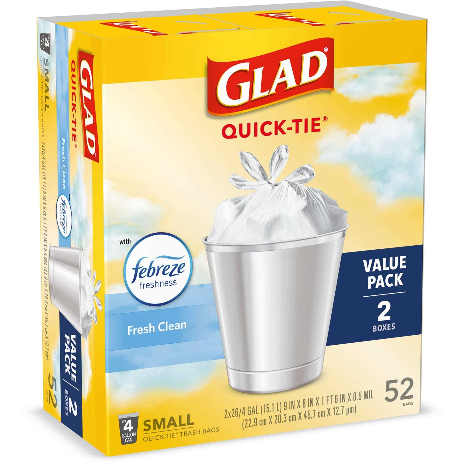 Glad Trash Bags, Quick-Tie, Fresh Clean, Small, 4 Gallon, Value Pack – 2 – 26 bags [52 bags]