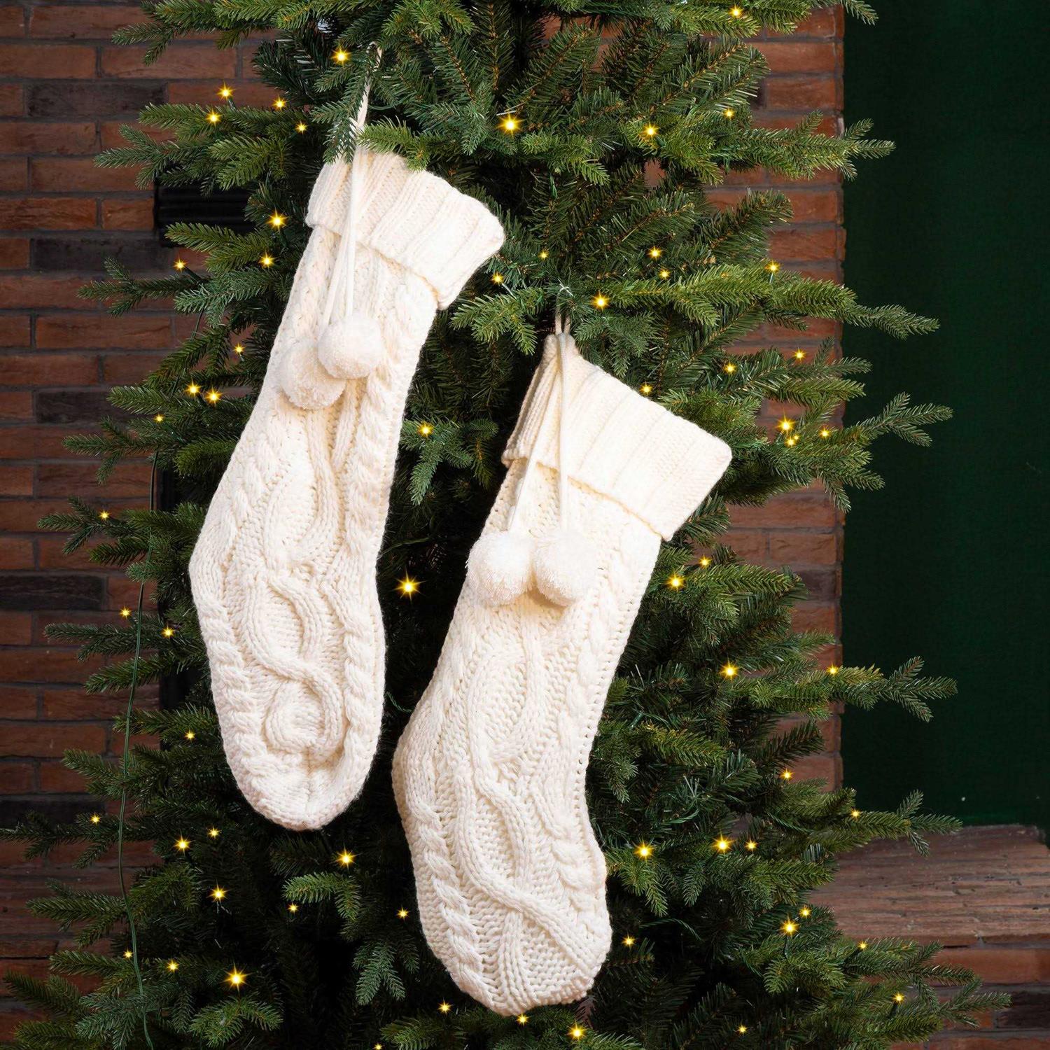 This set of two stockings is a beautiful addition for your holiday home. Each stocking features a cozy cable knit design in white with pom-pom ball accents. Hang this set on the Christmas tree or the mantel above the fireplace to give your home an unique festive touch.